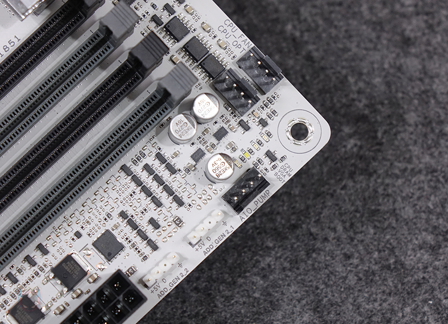 메모리 슬롯은 4개 구성으로 DDR5를 지원하며, DDR5 메모리에서부터 등장하기 시작한 24/48GB의 논-바이너리도 완벽히 지원해 최대 192GB 용량을 갖출 수 있고, 최대 클럭 9066MHz이상을 지원합니다. 슬롯 주변에는 CPU 팬과 수랭쿨러시 워터블록 4핀 커넥터를 비롯해 CPU/메모리/그래픽카드/저장장치가 제대로 인식되는지 확인할 수 있는 Q-LED, 5V ARGB 헤더 2개가 배치되어 있습니다. 그리고, 슬롯 앞자리에 배치된 메인보드 24핀 커넥터 왼쪽에는 USB 3.2 Gen2x2 헤더가 배치되어 있는데, PD 30W 충전도 지원하죠. 또한, 바로 옆에는 USB 3.0 내부헤더가 배치되어 있으며, 같은 라인에서 좀 더 내려가면 측면에서 연결할 수 있는 SATA 6 Gbps 커넥터 2개가 배치되어 있습니다.