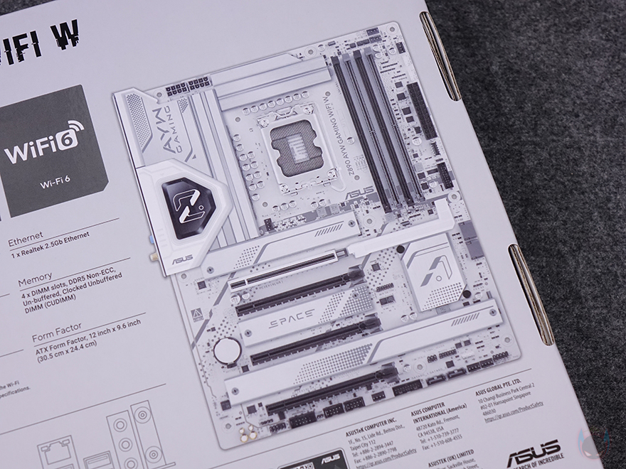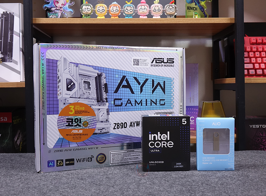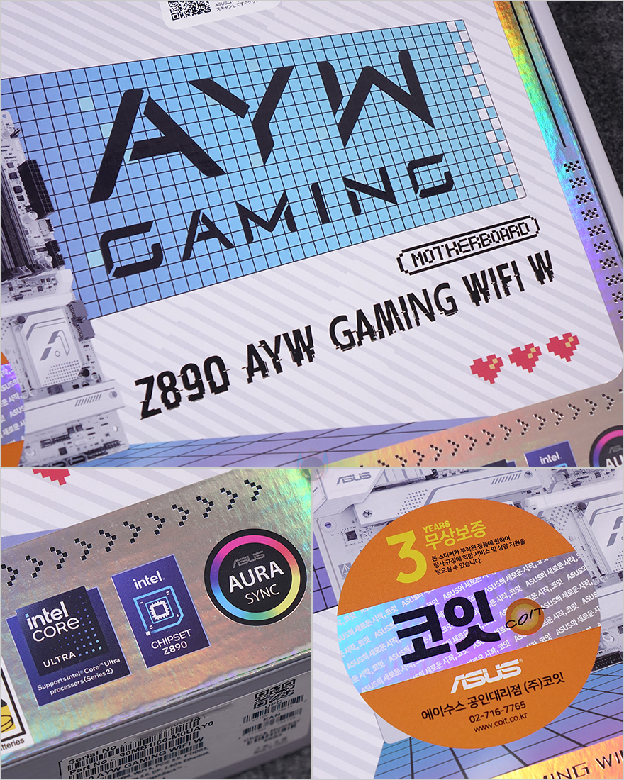 메인보드 같은경우에는 코어 울트라 시리즈2 CPU 출시와 함께 이를 지원하는 인텔 칩셋 Z890/B860/B810 메인보드 제품들이 나왔는데, 이번 체험에 사용되는 CPU가 오버클럭 지원의 K버전이기 때문에 메인보드 역시 CPU와 메모리 오버클럭 둘 다 지원하는 Z890칩셋 기반의 제품으로 사용되고, 제공되는 메인보드는 ASUS의 Z890 AYW GAMING WIFI W 모델입니다. AYW는 'As You Wish' 약자로 ASUS에서 가장 치근에 새롭게 추가된 라인업이죠. 기존의 PRIME 라인업과 TUF 라인업의 중간 위치라고 보면 됩니다. 최근 TUF 라인업에 블랙 콘셉트로 자리 잡으면서 사실상 화이트 콘셉트로 새 라인업이 생긴 거라고 보면 됩니다. 그래서, 제품 박스부터 살펴보면, 박스 디자인도 화이트를 배경으로 하고 있으며, 모델명과 함께 인텔 코어 울트라 시리즈2 지원, Z890칩셋 표기를 확인할 수 있고, ASUS 메인보드 국내 정식수입사 중 하나인 코잇의 3년 무상보증 스티커도 추가로 확인할 수 있죠. 박스 후면에는 제품 풀-샷 이미지를 담고 있어서 제품이 화이트 콘셉트라는 걸 미리 알 수 있으며, 이미지 옆에는 주요 특징과 제품의 기본 사양, 그리고 백패널 I/O 포트 구성 표기를 해놨습니다.