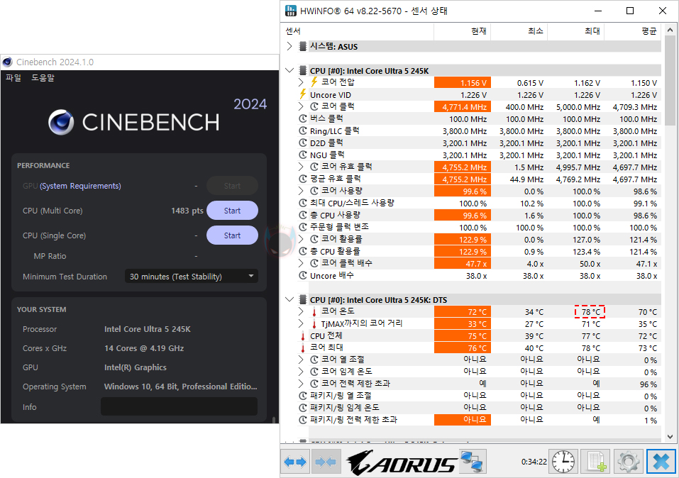30분간 렌더링 테스트를 통해 안정화를 진행한 결과, 정상적으로 통과되는 것을 확인할 수 있으며, CPU의 온도도 공랭쿨러로 약 78℃ 수준으로 무난한 편임을 확인할 수 있습니다. 참고로 씨네벤치 R24 멀티코어 점수는 1483점으로 나왔고, 이는 코어 울트라5 시리즈2 245K CPU에서 볼 수 있는 평균 점수대입니다. 안정화 테스트까지 마치고, 좀 더 성능을 끌어올리고 싶다면, CMOS 화면에서 Intel 200S Boost 옵션을 비활성화시키고, 수동으로 P-코어와 E-코어 배수 설정을 하면 됩니다. 최근 CPU들은 기본 설정으로 사용해도 부스트클럭이 높게 작동하기 때문에 예전만큼 오버클럭 수율이 높은 편은 아니라 수동 오버클럭을 통해서 높은 성능을 기대하기는 어렵지만, Intel 200S Boost 옵션보다는 좀 더 성능이 올라가는걸 확인할 수 있어 사용하는 소비자가 선택하면 되겠습니다. 그럼, 이번 시간 코어 울트라5 시리즈2 245K CPU를 살펴보는 시간으로 여기까 지로 하고, 다음 시간부터는 시스템을 최종적으로 구성해 게임과 작업 성능을 확인해 보는 시간을 가져보도록 하겠습니다.