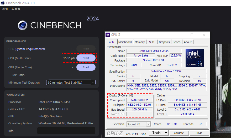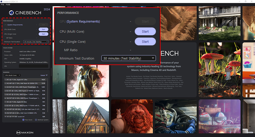 운영체제에서 CPU-Z 프로그램을 통해 다시 한 번 코어 울트라5 시리즈2 245K CPU와 ASUS Z890 AYW GAMING WIFI W 메인보드 최신 바이오스를 확인했으며, 안정화 테스트를 해보는데, 기본 설정값 상태로 진행해도 되지만, 사용하는 DDR5 메모리가 오버클럭 프로파일이 적용된 XMP 제품이라면, CPU와 메모리 성능 모두 끌어낼 수 있는 설정으로 진행하는 게 소비자에겐 더 좋죠. 필자 역시 XMP 프로파일이 적용된 메모리를 장착했기 때문에 CPU와 메모리 최적의 성능으로 끌어올려 안정화 테스트를 진행하는데, ASUS 메인보드 기준으로 바이오스 CMOS 화면으로 진입, ADVANCE MODE로 전환한 후 Ai Tweaker 메뉴로 들어가면 'Intel 200S Boost'라는 항목을 활성화(Enabled)해줍니다. 그럼, 메모리까지 자동으로 XMP로 적용된 것을 확인할 수 있습니다. 안정화 테스트 예전에는 프라임 95나 링스 같은 과부하에 특화된 프로그램들을 사용했지만, 실사용에서는 그만큼 과부하되는 경우는 없기 때문에 최근에는 실사용 작업처럼 진행해 과부하시켜주는 씨네벤치(Cinebench) R24를 많이 사용합니다. 해당 프로그램 홈페이지에서 다운로드 받은 후 실행을 시켜 테스트 진행 시간을 30분으로 설정하고, 멀티 코어로 Start 진행하면 됩니다.