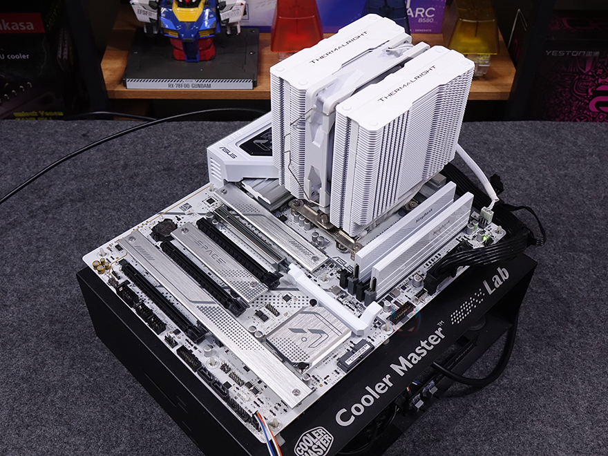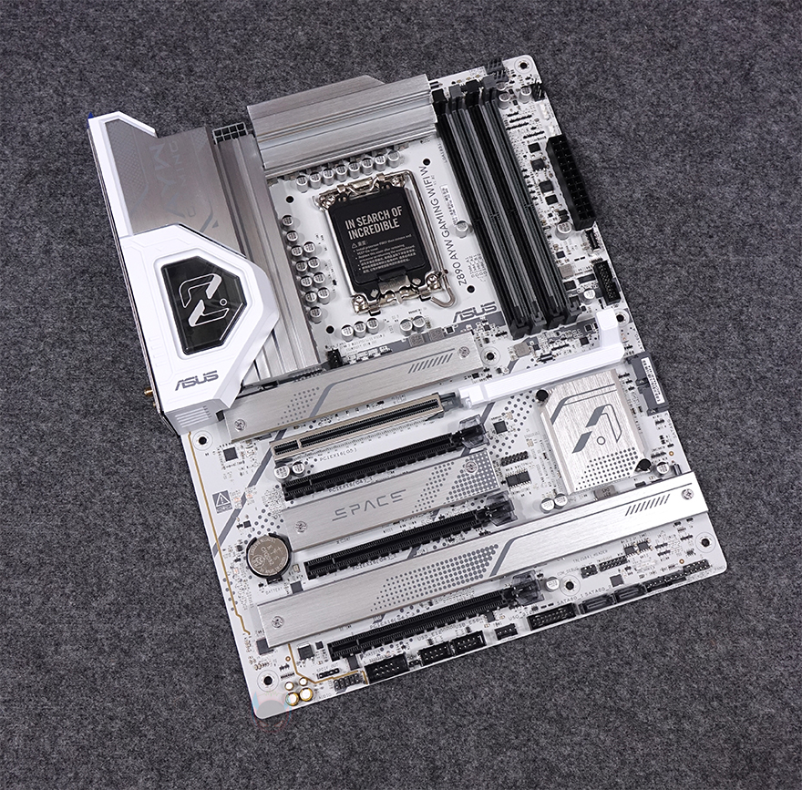 인텔 코어 울트라 시리즈2 CPU 지원의 ASUS Z890 AYW GAMING WIFI W 메인보드를 좀 더 살펴보면, 메인보드 크기는 ATX 폼 규격이며, 한눈에 봐도 화이트 콘셉트라는 걸 알아볼 수 있습니다. 그동안 ASUS 고가형 메인보드에서만 적용되던, 화이트 PCB기판을 적용했고, 방열판 부분도 화이트 계열에 가깝게 메탈 본연의 실버색상으로 갖추고 있죠. CPU가 장착되는 소켓 부분은 개봉 시 핀 보호를 위해 커버가 적용되어 있으며, 소켓 규격은 LGA 1851입니다. 참고로, 이전 세대와 소켓 규격은 바뀌어서 호환되지 않지만, CPU 쿨러 장착 홀은 이전 세대까지였던 LGA 1700과 동일한 위치로 쿨러 호환성을 유지했습니다.
