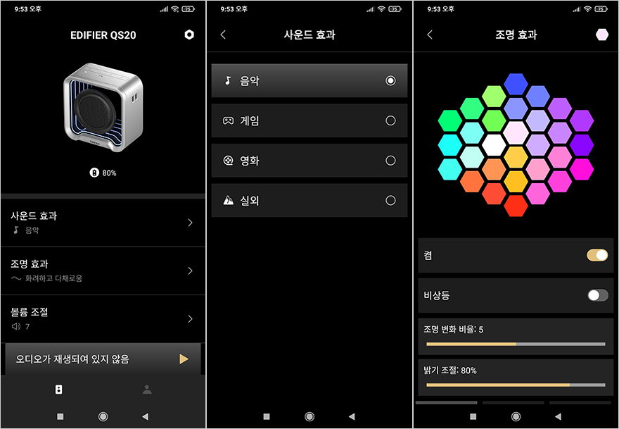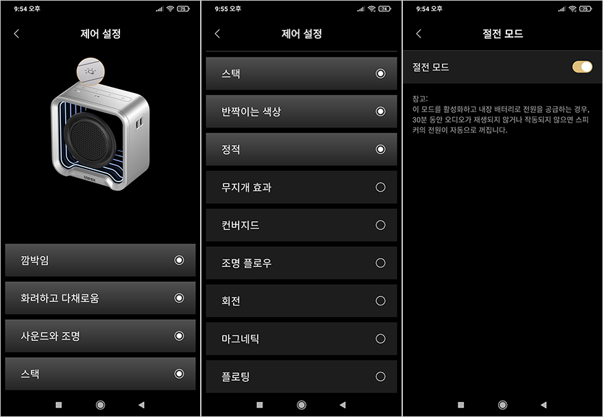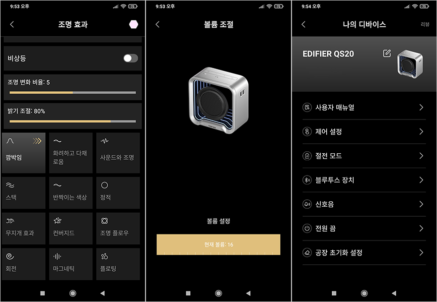 QS20 포터블 블루투스 스피커 역시 에디파이어의 공용 앱(App) ConneX를 지원합니다. 블루투스 연결이 정상적으로 진행되면, 앱에서 인식된 QS20 장치 메인화면을 확인할 수 있죠. 메인화면에서는 배터리 잔량과 함께 사운드 효과, 조명효과, 볼륨조절 3개의 메인메뉴를 확인할 수 있고, 사운드효과는 음악/게임/영화/실외 4가지 모드를 지원해주고 있으며, 조명효과는 앞서 언급했듯이 앱에서는 12가지 모두 다룰 수 있습니다. 그리고, 볼륨조절은 16단계로 조절이 가능한데, 연결기기에 따라서 볼륨조절이 기기와 동시에 작동되는 경우가 있고, 따로 작동되는 경우가 있습니다. 그리고, 디바이스 설정으로 들어가면 추가 설정들을 확인할 수 있는데, 제어설정에서는 앞서 언급했던 조명모드 버튼에 적용할 6가지 모드를 사용자가 지정할 수 있고, 절전 모드에서는 절전모드 On/Off, 신호음에서는 블루투스 연결 외에 최대 볼륨, 스테레오 모드 페어링 On/Off, 전원 끔에는 예약시간을 설정할 수 있으며, 공장 초기화 설정도 디바이스 메뉴에서 On/Off 할 수 있습니다. 참고로, 조명모드 효과에서 사운드에 반응하는 모드는 사운드와 조명, 마그네틱, 플로팅 3가지 모드입니다.