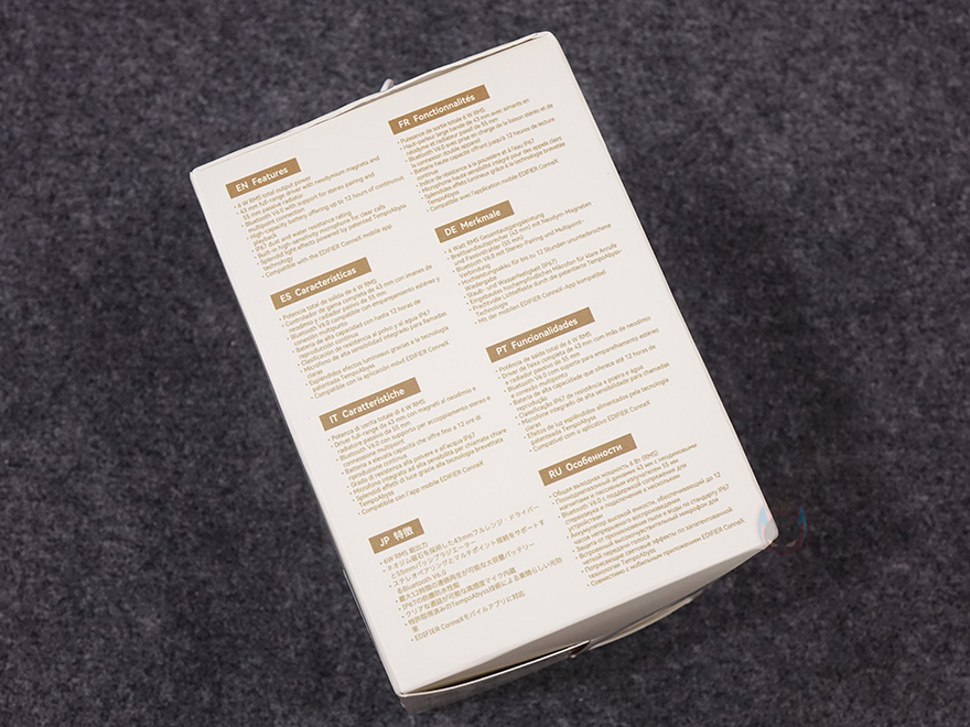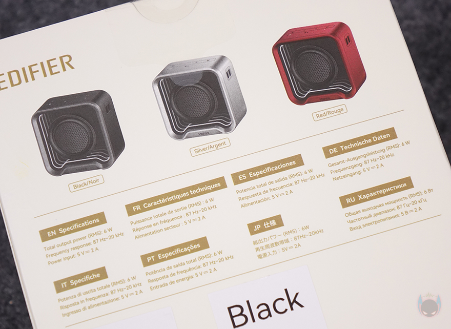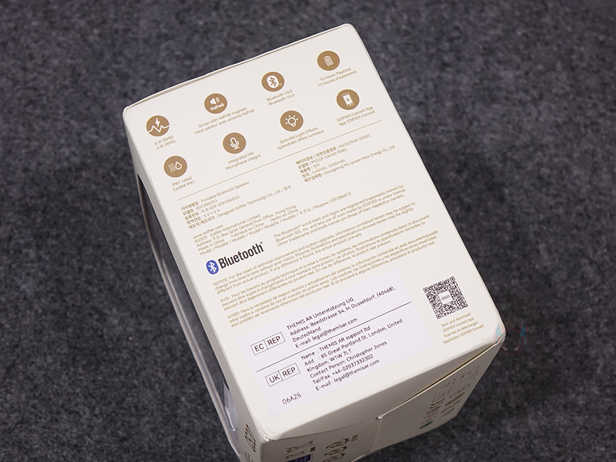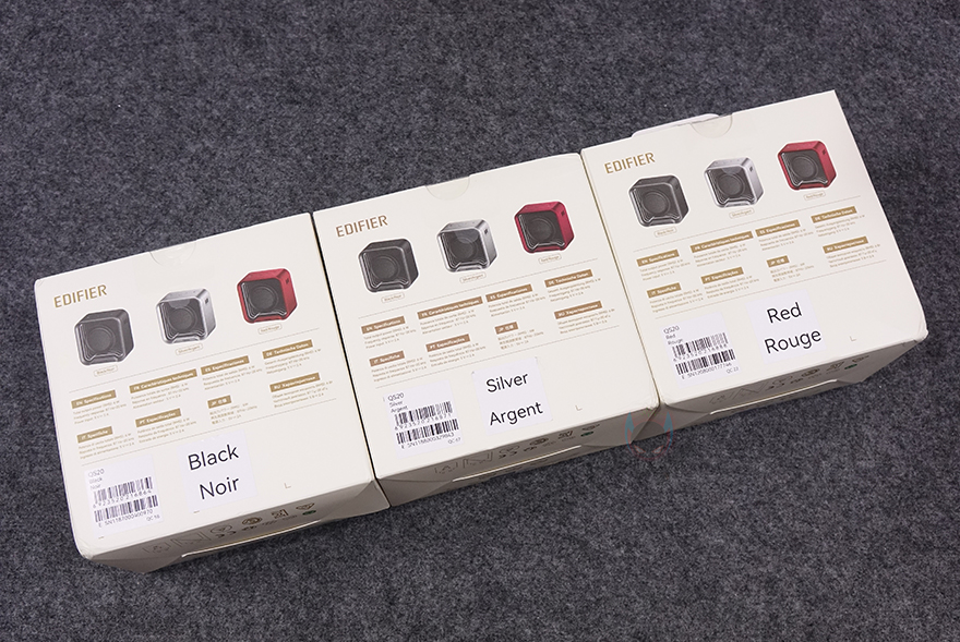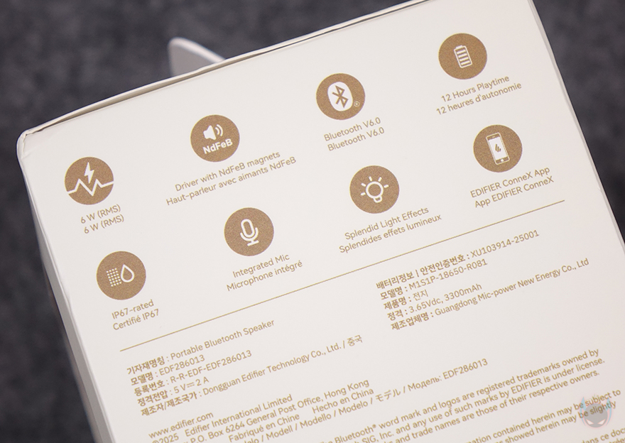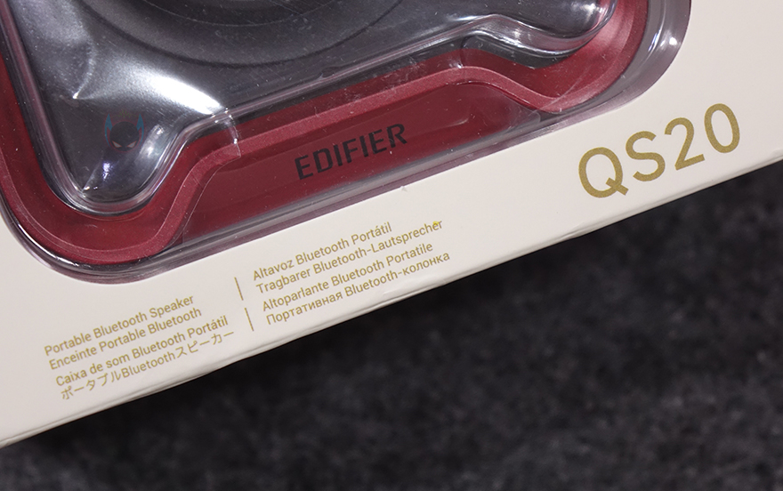 제품 패키지부터 살펴보면, 포터블 스피커인 만큼 작은 사이즈를 가져서 박스 크기도 작습니다. 그리고, 뒤에서 다시 확인하겠지만, QS20은 3가지 컬러로 출시했고, 색상구분이 쉽도록 내부 포장된 스피커를 외부에서도 확인할 수 있도록 모델명과 함께 박스 전면을 노출시켰습니다. 그리고, 박스 한쪽 측면에는 주요 특징으로 총 6W(RMS) 출력, 네오디뮴 자석(NdFeB) 드라이버 유닛, 블루투스 6.0 버전 지원, 최대 12시간 재생, IP67등급 방수, 내장 MEMS 마이크, 조명효과, ConneX 공용 앱 지원을 표기해 놨는데, 에디파이어 스피커에 관심이 있는 소비자라면, 이부분만 봐도 자사에 유사한 모델이 있었다는 걸 짐작할 수 있습니다. 바로, 먼저 출시했던 ES20입니다. 블루투스 버전, 재생시간, 조명효과를 제외하면 나머지 특징은 ES20과 동일하죠. 그리고, QS20은 국내에서도 정식출시한 모델이라 한국어로 기본 사양이 표기된 것도 확인할 수 있으며, 반대쪽 측면에는 다국적으로 한 번 더 주요 특징 표기를 확인할 수 있습니다. 또한, 박스 후면에는 방금 언급한 3가지 컬러의 제품 이미지를 확인할 수 있죠.