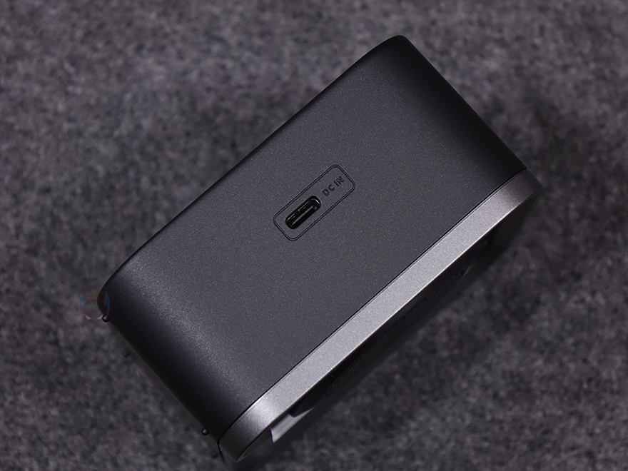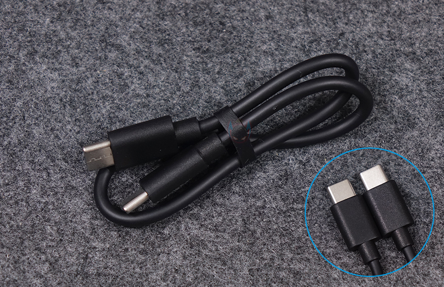 그리고, 상단에는 ES20과 마찬가지로 버튼(button)들이 배치되어 있는데, 오른쪽부터 전원(Power), 볼륨조절+/-, 조명모드 기능 버튼 순이며, 버튼 앞부분에는 내장형 MEMS 마이크가 탑재되어 스마트폰 같은 모바일기기와 연결했을 시 전화통화도 가능합니다. 그리고, 마이크 표시에서 맨 왼쪽으로는 충전상태를 확인할 수 있는 LED 인디케이터도 배치되어 있습니다. 또한, 충전포트는 스피커 왼쪽에 배치되어 있으며, USB Type-C 포트이고, 반대쪽 측면에는 후면 방향 윗부분에 스트랩-줄을 장착할 수 있게 홀을 처리해 놨죠. 스피커 밑바닥 부분에는 돌기형태의 받침대 디자인과 국내에도 정식출시한 제품이라 KC인증마크를 확인할 수 있습니다. 기본 제공되는 USB 충전케이블은 약 30cm이며, 양쪽 모두 USB Type-C 인터페이스를 가졌습니다.