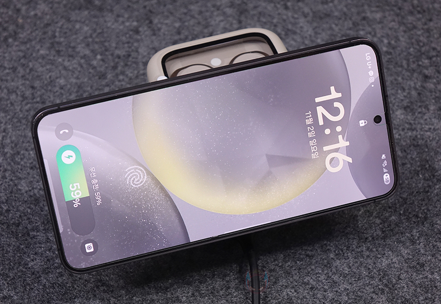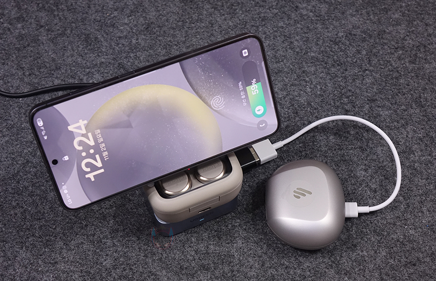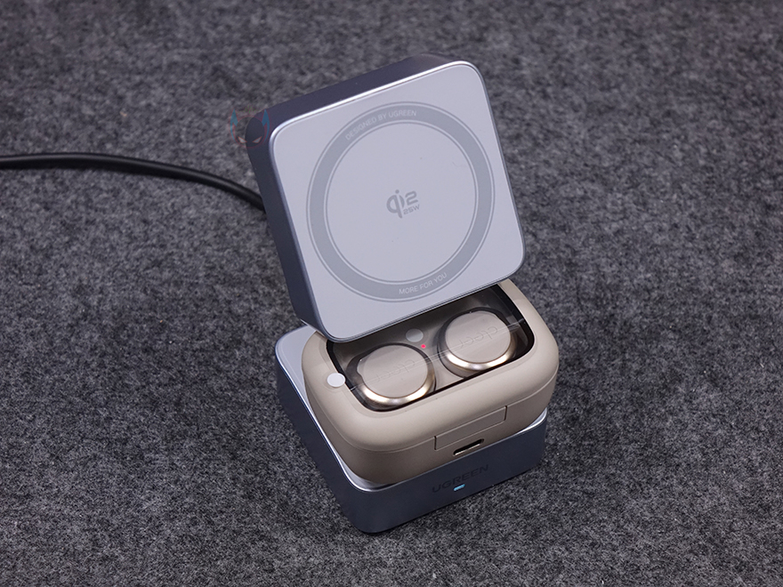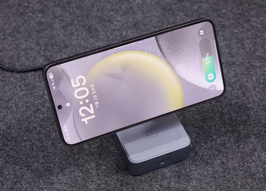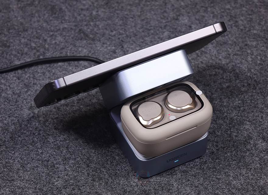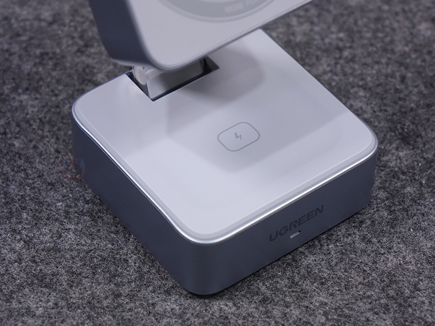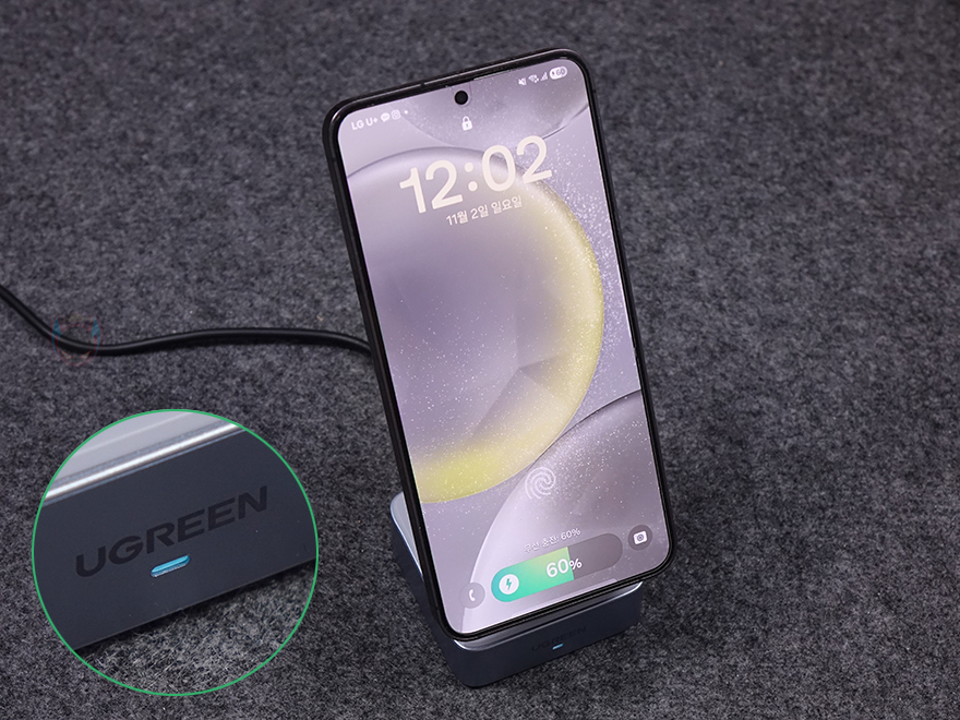 직접, 유그린 MagFlow 2-in-1 마그네틱 무선 충전기를 사용해보면, 상판 무선 충전이 기본적으로 마그네틱 방식이라 충전 콘셉트 기준은 애플 아이폰에 맞춰서 있습니다. 하지만, 이미 앞전에 출시한 모델과 마찬가지로 이번 모델도 무선 충전을 지원하는 기기는 모두 호환이 되고, 마그네틱 링이나 마그네틱 케이스를 사용한 스마트폰이면 동일하게 부착해서 사용할 수 있습니다. 실제 삼성 갤럭시 스마트폰도 마그네틱 링을 부착해 무선 충전이 되는 걸 확인할 수 있었고, 무선 충전 시 앞부분 로고 아래 LED가 점등되는 것도 확인할 수 있었죠. 또한, 수직, 수평 어느 방향이든 자유롭게 충전도 됩니다. 또한, 하판은 무선 이어폰 용도로 사용되는데, 역시 꼭 애플 무선 이어폰 제품이 아니라도 무선 충전을 지원하는 무선 이어폰은 모두 호환이 됩니다. 스마트폰과 동시에 충전할 때는 자리 침범이 생길 수 있기 때문에 스마트폰은 수평으로 올려두는 게 낫습니다. 그리고, 측면 USB-C 포트를 통해서도 유선 충전을 추가할 수 있어서 최대 3대를 동시에 충전도 가능하죠.