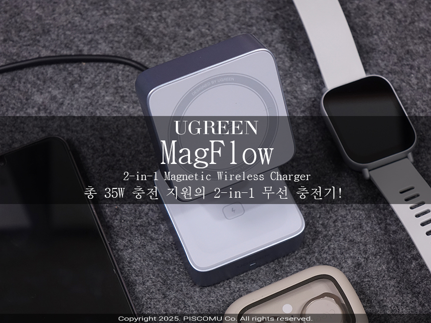 일반적으로 스마트폰 충전기라고 하면, 콘센트에 꽂아 사용하는 플러그형 충전기를 많이 떠올리죠. 하지만, 이제는 충전기도 다양하게 나오고 있습니다. 야외나 여행을 갈 때 덩치가 큰 플러그형 충전기보다 보조배터리 같은 외부 장치에 연결해 사용할 수 있는 휴대가 편한 접이식 충전기 제품들도 많죠. 특히, 최근 플래그쉽 스마트폰들은 Qi2 무선 충전을 지원하고 있어서, Qi2 무선 충전까지 갖춘 접이식 충전기 제품이 나오고 있는데, 유그린도 이번에 또 하나의 접이식 Qi2 무선 충전기를 선보였습니다. 바로, 마그네틱 방식의 MagFlow 2-in-1 무선 충전기죠. 물론, 유그린은 올해 초 비슷한 접이식 Qi2 무선 충전기(https://piscomu.com/314988)를 선보인적 있는데, 당시 출시한 모델은 총 25W 지원이었습니다. 이번에 출시한 MagFlow 2-in-1 마그네틱 무선 충전기는 총 35W로 좀 더 높아졌죠. 그럼, 한 번 살펴보도록 하겠습니다.