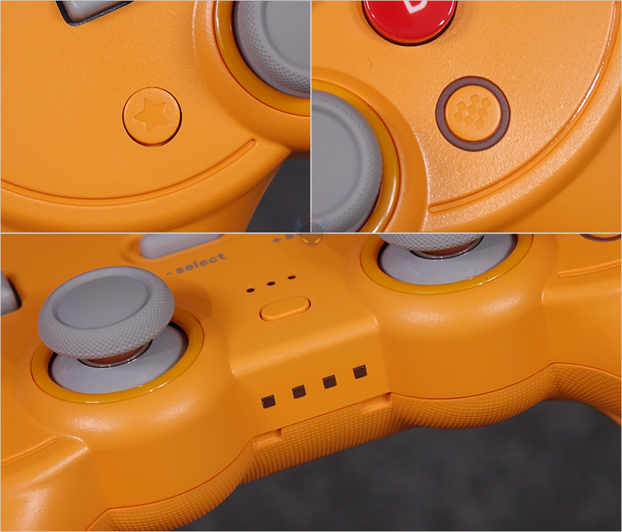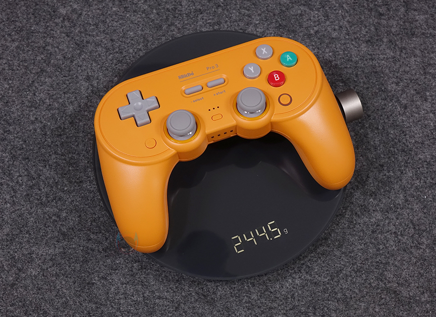 게임패드와 충전독을 분리해서 좀 더 자세히 살펴보면, 먼저 게임패드 같은경우 Pro 시리즈 특유의 레트로 디자인을 Pro 3에서 그대로 이어갑니다. 물론, 뒤에서 확인하겠지만, 기능 부분에서는 꽤 변화가 많죠. 무게는 약 245g으로 무거운 편은 아닙니다. 그리고, 게임패드 상단부의 버튼과 조이스틱 배치도 이전 모델과 동일하게 적용되어 있습니다. 가운데 -선택(-select)과 +시작(+start) 버튼을 기준으로 왼쪽으로는 방향키 D-Pad, 오른쪽에는 XYAB 버튼, 아래에는 조이스틱(LR/R3)이 배치되어 있죠. 각 조이스틱 양쪽에는 시작(Start)과 홈(Home) 버튼이 배치되어 있고, 조이스틱 사이 가운데는 설정(Profile) 버튼과 설정모드를 확인할 수 있는 LED 인디케이터가 배치되어 있으며, 같은 위치에 아랫부분 안쪽에는 연결상태(Status)를 확인할 수 있는 LED 인디케이터가 배치되어 있습니다.