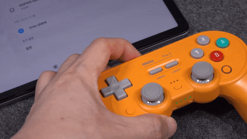 그리고, 모바일/닌텐도스위치 모두에서 사용할 수 있는 블루투스 연결 같은 경우 안드로이드(Android) 모바일 기준에서는 연결모드 스위치를 D로 선택합니다. 스위치 선택 후 USB-C 포트 옆에 배치된 페어링 버튼을 3초 이상 누르면 페어링 모드가 시작되는데, 모드가 시작되면 조이스틱 아래쪽 LED 인디케이터가 순차 반복적으로 깜빡이고, 이 상태에서 모바일 기기에서 블루투스 검색을 통해 8BitDo Pro 3가 검색되면 선택하고 연결해 주면 되죠. 조금 아쉬운 점이라면, 모바일 기기에서도 Ultimate Software V2 앱을 지원하는데, 현재는 애플 iSO에서만 지원됩니다. 그리고, 닌텐도 스위치에서 블루투스로 연결할 때는 연결모드 스위치를 S로 선택하고, 역시 페어링 버튼을 3초 눌려서 페어링 모드를 실행한 후, 닌텐도 스위치에서 컨트롤→잡는 방법/순서변경 메뉴로 이동해 양쪽 트리거(L2/R2)를 눌러주면 연결이 됩니다.
