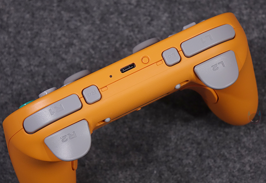 게임패드 전면에는 이전 모델과 동일하게 좌우 양쪽으로 L1/R1 범퍼 버튼과 L2/R2 트리거(Triggers)가 배치되어 있으며, Pro 3에서 새롭게 L4/R4 확장 버튼이 추가되었습니다. 그리고, 중간에는 유선 사용 시 USB 케이블과 연결되는 USB-C 포트가 배치되어 있고, 양쪽에 각각 블루투스 페어링 버튼과 전원 LED 인디케이터가 배치되어 있죠. 참고로, 트리거는 홀-이펙트이며, 각 트리거 옆에는 트리거 잠금/해제 스위치고 함께 배치되어 있습니다. 패드 하단이자 그립 후면에는 각각 양쪽으로 백버튼이라 부르는 패들(PL/PR) 버튼이 배치되어 있으며, 버튼 사이 가운데 부분에는 충전독과 접촉하는 포고핀 단자, 바로 아래에 연결모드 스위치가 배치되어 있습니다. 그리고, 양쪽 그립 부분은 그립감과 미끄럼 최소화를 위해 엠보싱 디자인이 적용되었죠.