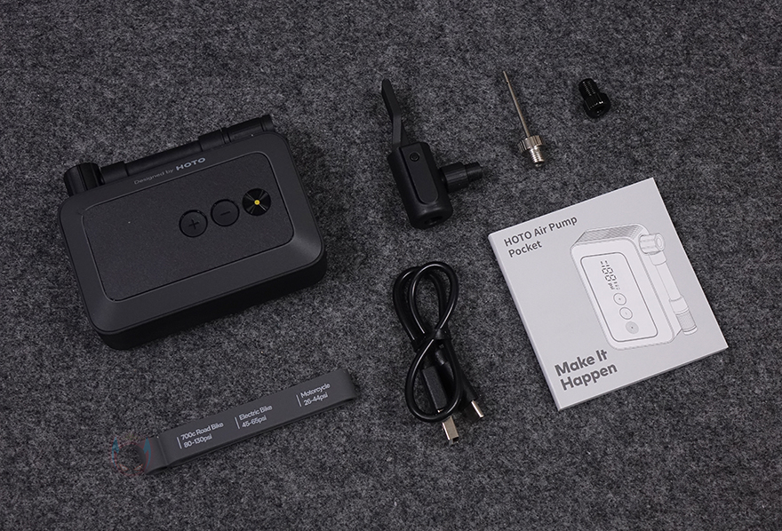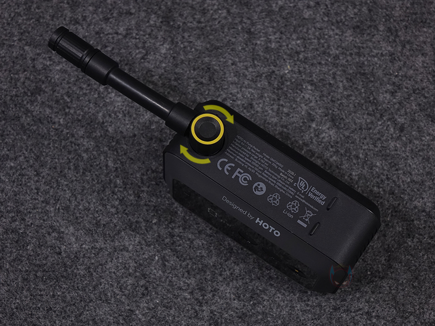 본격적으로 HOTO의 Air Pump Pocket를 살펴보면, 일단 한눈에 봐도 사이즈가 작다란 걸 쉽게 체감할 정도로 작은 사이즈를 자랑합니다. 정확히는 93×58×38mm 크기를 가졌는데, 두께를 제외하고 면적만 놓고 요즘 스마트폰과 비교해 봐도 작은 사이즈임을 알 수 있고, 성인 손바닥보다 작은 편이라 주머니에 넣고 다닐 수 있는 정도죠. 무게도 약 260g으로 스마트폰보다 약간 무거운 편이라 휴대에 무게 부담감이 전혀 없습니다.
