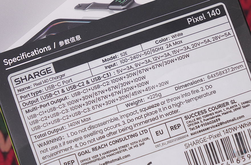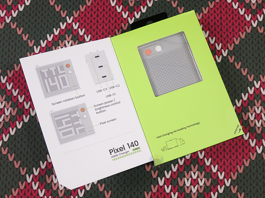 그리고, 박스 한쪽 측면에는 색상 표기, 반대쪽 측면에는 제품의 주요 특징을 표기해 놨는데, 픽셀 디스플레이, 고급 GaN 기술, 컴팩트 사이즈, 접이식 플러그를 언급하고 있습니다. 박스 후면에는 제품 사용 연출 이미지와 함께 제품의 기본 사양을 표기해 놨으며, 박스를 열어보면, 제품 크기에 맞춘 캡-방식의 포장재를 사용했고, 구성품은 Pixel 140 충전기와 제품설명서로 이루어져 있습니다. 개봉 시 충전기 부분에는 보호비닐이 적용되어 있죠.