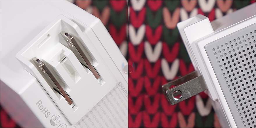 이번엔 플러그(Plug) 부분을 살펴보면, 리뷰에선 EU 플러그 모델로 기본 110V 플러그에 EU 플러그 어댑터가 장착되어 있는 형태입니다. 그래서, 플러그 어댑터 윗부분의 스위치 레버를 앞으로 밀고 올리면 어댑터 분리가 가능하죠. 그럼, 기본 플러그인 110V의 US 플러그를 확인할 수 있는데, 접이식으로 적용되어 있습니다. 조금 아쉬운 점이라면, 구매할 때 EU 플러그와 US 플러그를 선택할 수 있는데, EU 플러그를 선택하면 어댑터와 연결되는 부위가 돌기형으로 적용되어 있고, US 플러그는 돌기형 없이 깔끔한 디자인으로 처리되어 있죠. 물론, 둘 다 100~240V 프리볼트를 적용했기 때문에, 만약 국내에서 220V 사용 시 콘센트에 깔끔하게 들어간 모습을 원한다면, US 플러그를 선택해서 별도의 220V 어댑터를 사용하면 됩니다. 그리고, 플러그 연결부 뒤쪽에는 앞서 제품 박스에서 확인한 제품의 기본 사양 표기를 다시 확인할 수 있죠.