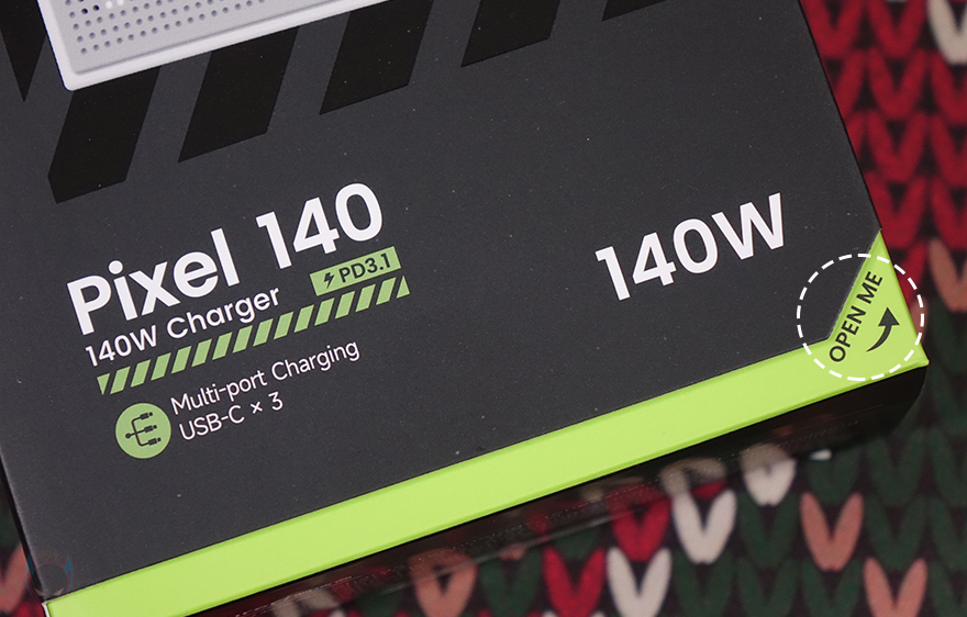 제품박스부터 살펴보면, 박스 전면에 제품 이미지를 담고 있어서 개봉 전에 제품 디자인을 미리 확인할 수 있습니다. 한눈에 봐도 이 제품 이름에 왜 Pixel(픽셀)이 붙었는지 알 수 있죠. 그리고, 모델명 아래에는 PD 3.1 규격과 함께 총 140W 충전 지원 표기를 확인할 수 있으며, 앞서 만났던 3-in-1 보조배터리와 마찬가지로 박스 전면 오른쪽에는 OPEN ME 표기를 해서 도어 방식의 커버를 적용했습니다. 커버를 열면, 내부에 포장된 Pixel 140 충전기 실물을 일부 볼 수 있으며, 커버 안쪽에는 제품의 주요 명칭과 기능을 표기해 놨죠.