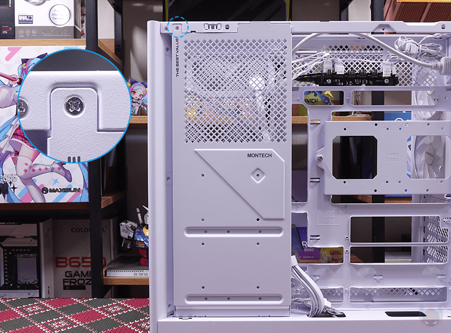 상단 패널을 분리하면, 앞서 확인한 전면 강화유리 패널을 분리할 수 있습니다. 전면 강화유리 패널 역시 무나사 방식의 볼-헤드핀 클램프를 적용했으며, 패널 상부를 열 때 낙하방지를 위한 하부 걸쇠 장치도 적용되어 있죠. 그리고, 왼쪽 측면 강화유리 패널 역시 상단 패널이 분리된 상태에서 분리할 수 있으며, 역시 볼-헤드핀 클램프와 낙하방지의 걸쇠 장치가 적용되어 있습니다. 오른쪽 측면 패널은 새시 패널로 내부 측면 쿨링효과를 위해 패널 앞자리에 상단패널처럼 사각 디자인의 에어홀을 적용했으며, 새시 패널 역시 무나사 방식의 볼-헤드핀 클램프를 적용했지만, 하부에는 낙하방지 걸쇠가 없기 때문에 분리 시 끝까지 잡고 분리시켜야 합니다.