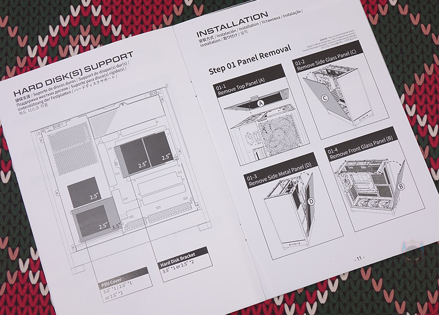 제품 포장은 PC케이스 비닐포장에 외부 충격보호를 위한 포장재로 일반적으로 많이 사용하는 스티로폼보다 좀 더 완충효과가 좋은 우레탄폼을 사용했습니다. PC케이스를 제외한 나머지 구성품에는 제품 설명서, 여분의 클램프, 각 종 부품 장착에 사용되는 나사들, 그래픽카드 지지대, 소량의 케이블 타이와 벨크로타이 기본 제공으로 이루어져 있으며, 설명서는 이미지와 함께 조립가이드 내용을 담고 있고, 배송 시 PC케이스 전면과 측면 강화유리에는 보호비닐이 부착되어 있습니다.