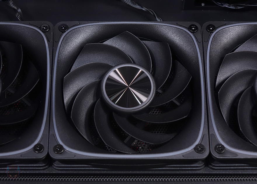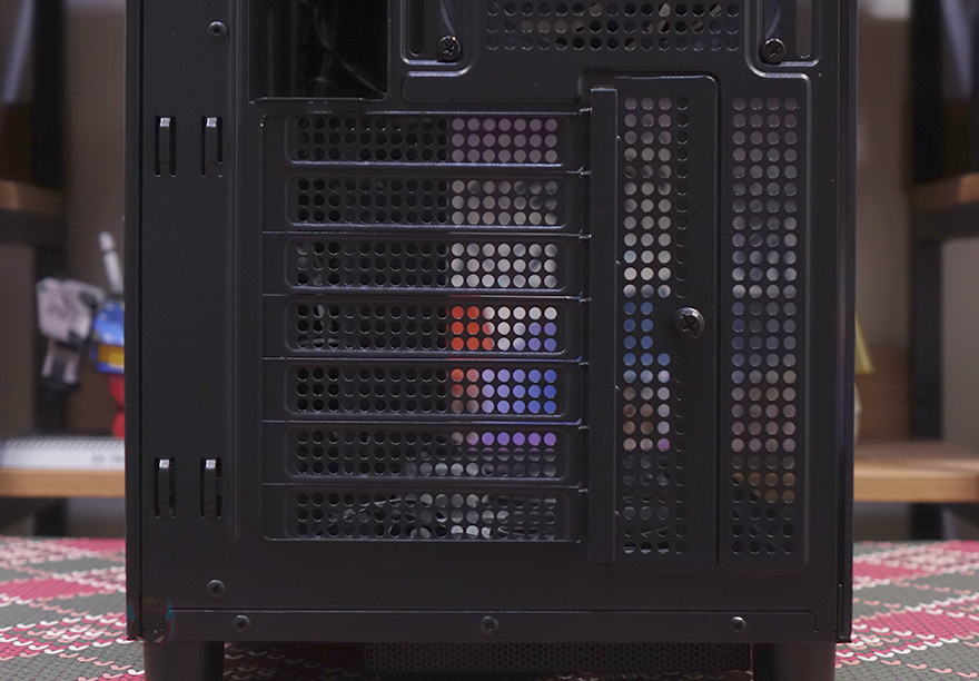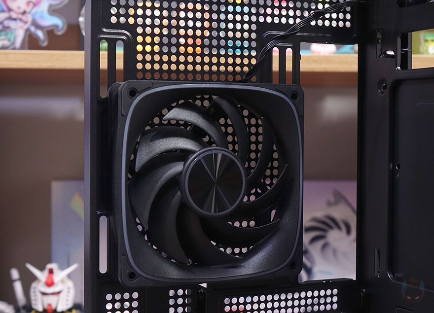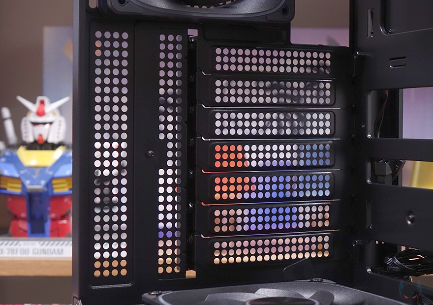 내부 하단에는 앞서 언급했듯이 하단 쿨링시스템으로 120mm 팬이 최대 3개 기본 장착되어 있습니다. 외부 공기를 흡입하는 역할로 리버스 팬이 적용되었고, 팬 프레임 테두리에 RGB 라이트닝 효과를 볼 수 있는 ICEROCK C30 120 모델입니다. 그리고, 앞서 하단 쿨링시스템 같은 경우 매립 형태라고 언급했는데, 그 이유는 바로 팬 각도조절을 하기 위해서입니다. 팬을 장착하고 있는 브래킷 양쪽에는 팬 안쪽 방향 그러니깐 메인보드 트레이 쪽 팬 방향을 올리고 내릴 수 있게 각도조절을 할 수 있습니다. 고무와셔와 나사 조합에 단계별 홈을 적용해 손으로 쉽게 올리고 내릴 수 있으며, 5단계로 조절이 가능하죠. 높일수록 그래픽카드로 전달되는 풍량이 더 많아지고 후면으로 빠지는 속도도 신속해질 수 있습니다. 후면 배기 역할의 120mm 팬 역시 하단과 동일한 팬이지만, 배기역할이기 때문에 팬 방향은 정방향이며, 아래 PCI슬롯 가이드는 재사용이 가능한 착탈식으로 적용되었죠.