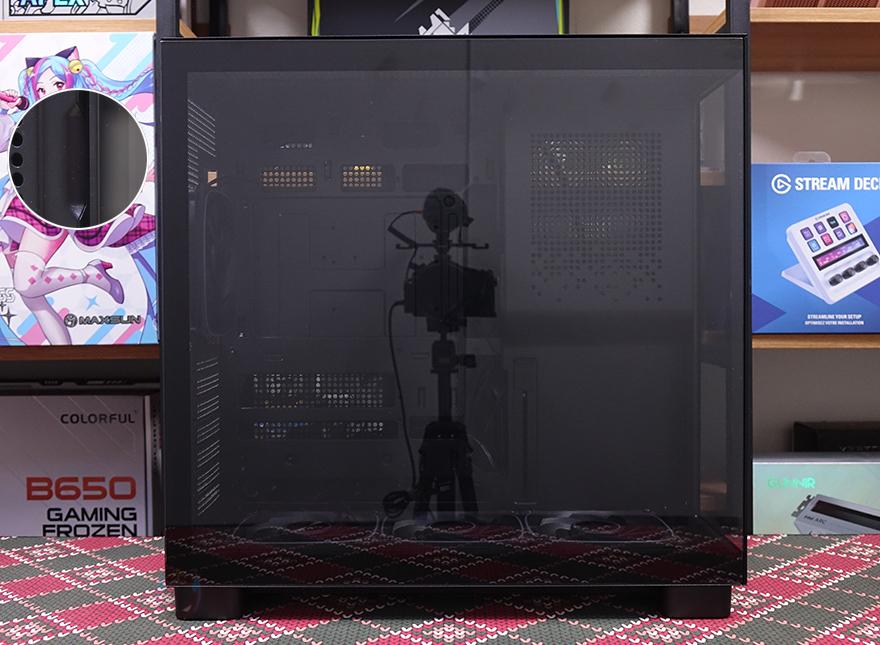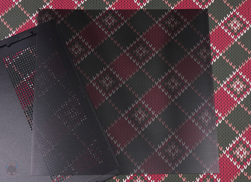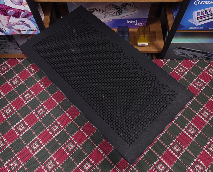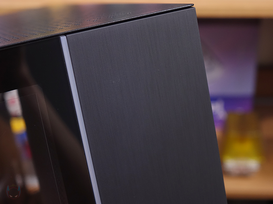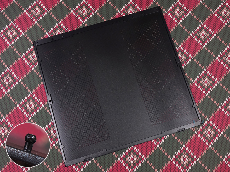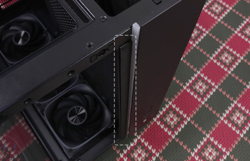 측면 패널 같은 경우에는 전면 기준 왼쪽 측면에 전면 강화유리와 마찬가지로 스모크 강화유리 패널이 적용되었으며, 후면 손잡이 부분을 통해 역시 볼-헤드핀 방식이라 손쉽게 분리할 수 있습니다. 그리고, 패널 안쪽에는 파손방지를 위해 프레임도 적용되어 있죠. 오른쪽 패널은 일반 새시 패널로 중앙을 제외한 패널 양쪽으로 타공망 처리를 해놨는데, 역시 후면 손잡이를 통해 볼-헤드핀 방식으로 쉽게 분리할 수 있고, 분리하면 패널 안쪽에 패널 전체를 덮는 먼지 필터가 장착된 걸 확인할 수 있습니다.