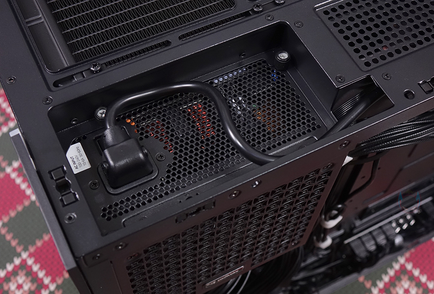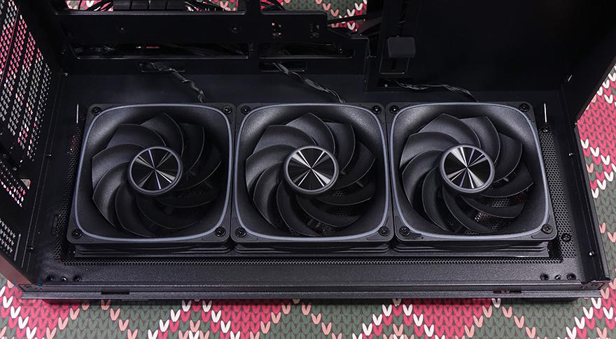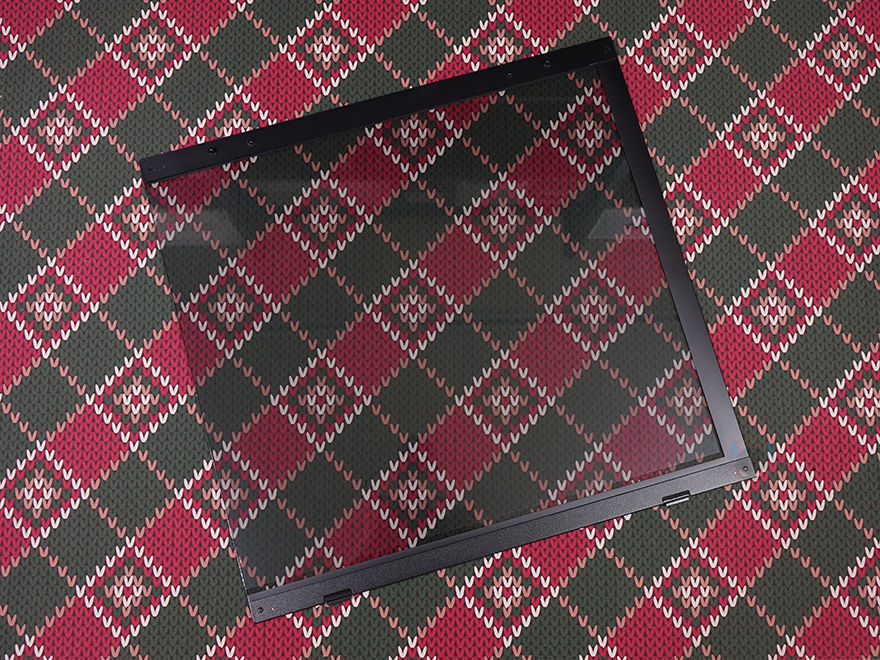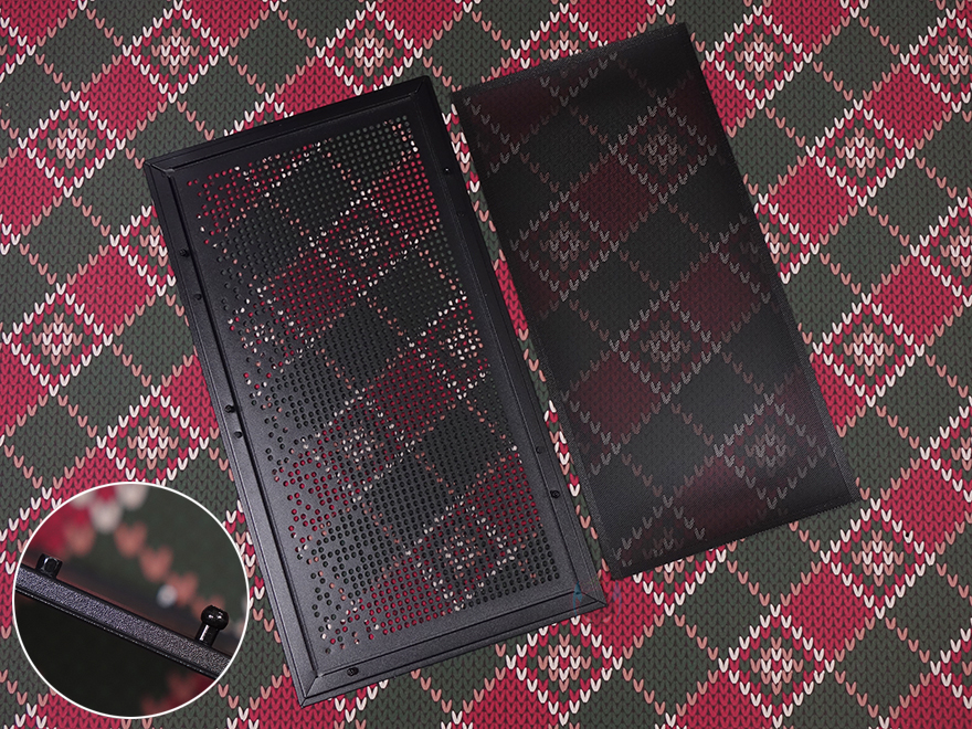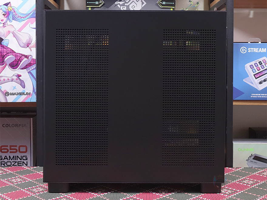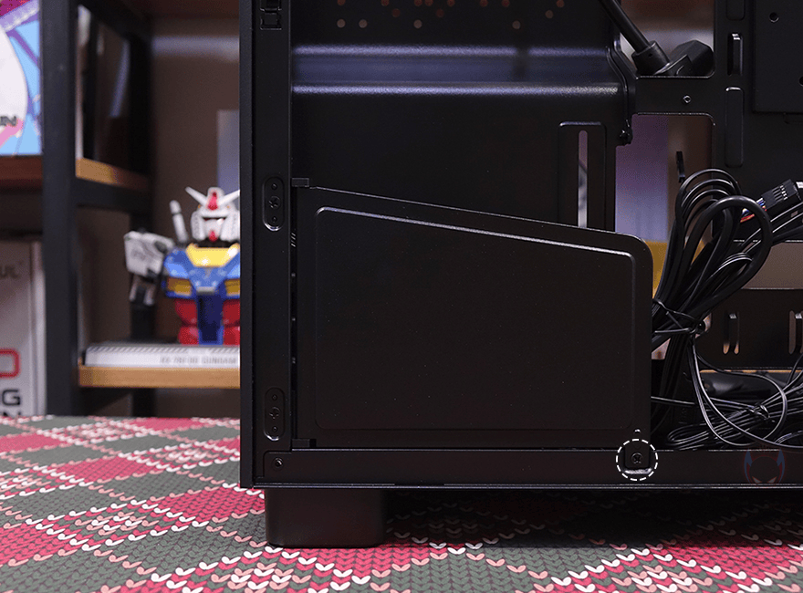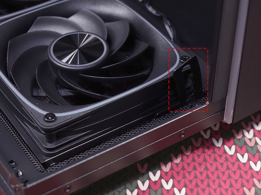 측면 패널 같은 경우에는 전면 기준 왼쪽 측면에 전면 강화유리와 마찬가지로 스모크 강화유리 패널이 적용되었으며, 후면 손잡이 부분을 통해 역시 볼-헤드핀 방식이라 손쉽게 분리할 수 있습니다. 그리고, 패널 안쪽에는 파손방지를 위해 프레임도 적용되어 있죠. 오른쪽 패널은 일반 새시 패널로 중앙을 제외한 패널 양쪽으로 타공망 처리를 해놨는데, 역시 후면 손잡이를 통해 볼-헤드핀 방식으로 쉽게 분리할 수 있고, 분리하면 패널 안쪽에 패널 전체를 덮는 먼지 필터가 장착된 걸 확인할 수 있습니다.