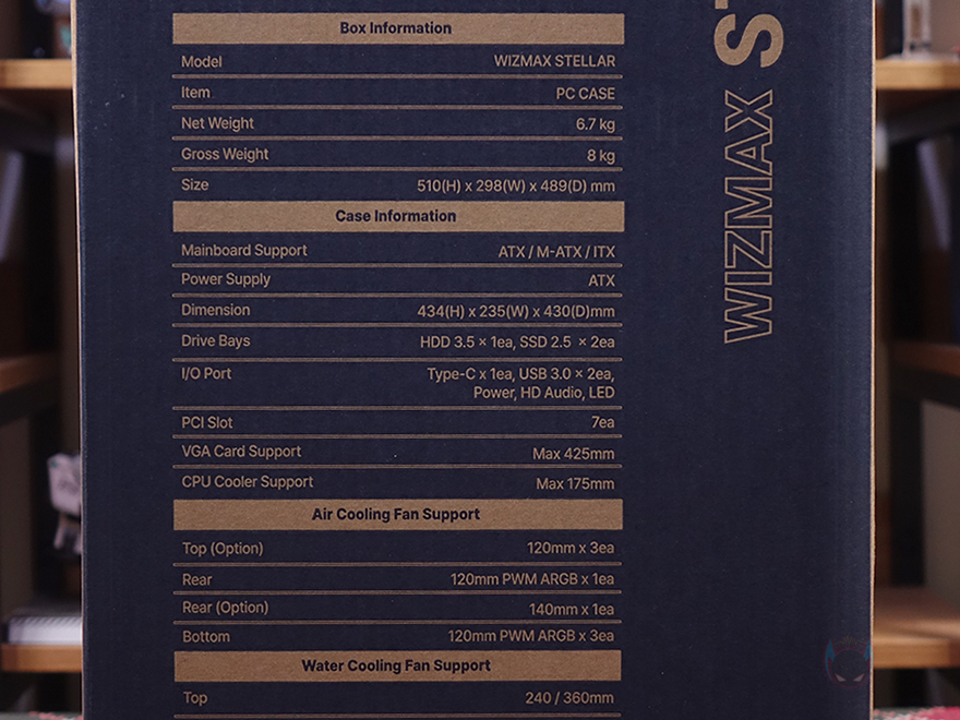 마이크로닉스의 위즈맥스 라인업 PC케이스 제품들은 제품박스에 모델명만 표기해서 나오는 게 특징이죠. 위즈맥스 스텔라 역시 전후면에 마이크로닉스 로고와 모델명만 표기해 놨습니다. 그리고, 박스 한쪽 측면에는 위즈맥스 브랜드가 글로벌시장을 겨냥해 탄생했기 때문에 한국어를 포함해 다국적 언어로 제품 주요 특징을 표기해 놨는데, 패널 디자인, 하단 브래킷, 전면 파워서플라이 장착, USB-C 포트, 8포트 허브, 후면 커넥터 메인보드 장착 지원을 언급하고 있습니다. 뒤에서 확인하겠지만, 눈여겨볼 부분은 하단 브래킷과 전면 파워서플라이 장착 지원이죠. 반대쪽 측면에는 제품의 기본 사양을 표기해놨는데, 그래픽카드 길이, 쿨러 높이, 팬, 수냉쿨러 라디에이터 지원까지 상세하게 표기해 놨기 때문에 오프라인 매장 구매 시에도 도움이 됩니다.