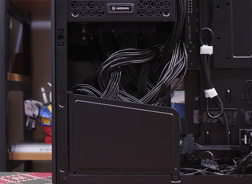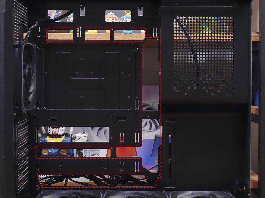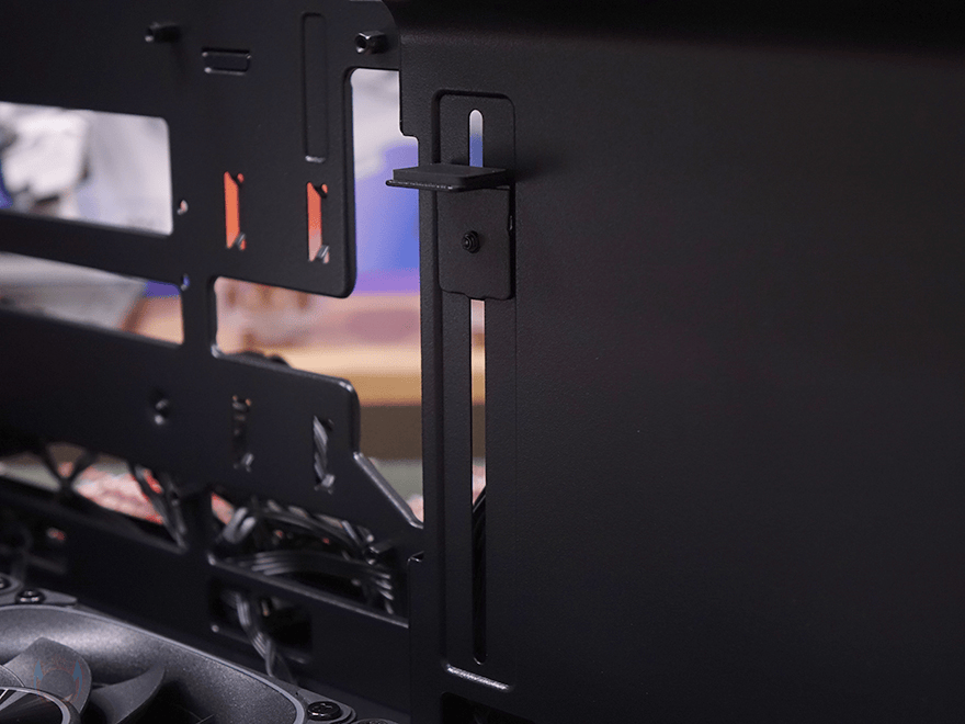 이제 위즈맥스 스텔라 PC케이스의 내부를 살펴보는데, 먼저 메인보드가 장착되는 트레이 부분에는 앞서 주요 특징에 표기해 놨듯이 메인보드 커넥터가 후면에 배치된 일명 BTF라 부르는 백-커넥터 메인보드를 장착할 수 있게 커넥터홀이 처리되어 있습니다. ATX와 MATX 모두 지원하죠. 그리고, 역시 앞서 외부 상단에 미리 확인했듯이 트레이 오른쪽 전면 방향에는 파워서플라이 자리로 PSU 커버를 적용해 공간 분리를 해놨고, 상단패널 타공망 디자인처럼 커버 부분에도 동일한 디자인을 적용했습니다. 또한, PSU 커버 아래에는 그래픽카드 지지대도 기본 적용되어 있는데, 그래픽카드 앞쪽이 아닌 뒤쪽에서 받쳐주는 지지대죠. 물론, 높낮이 조절이 가능합니다.