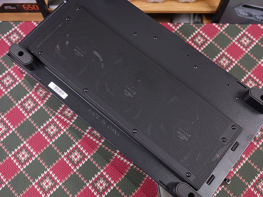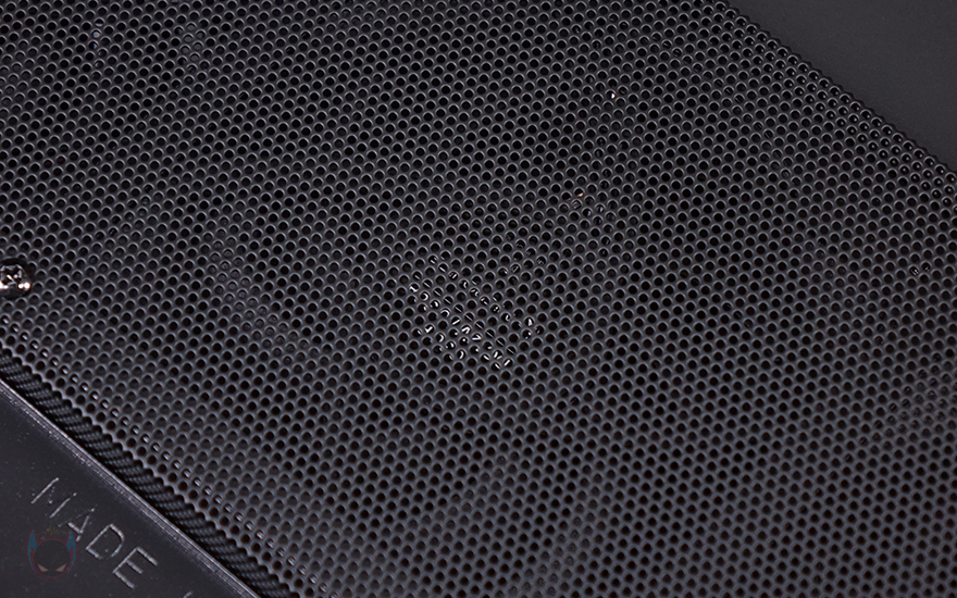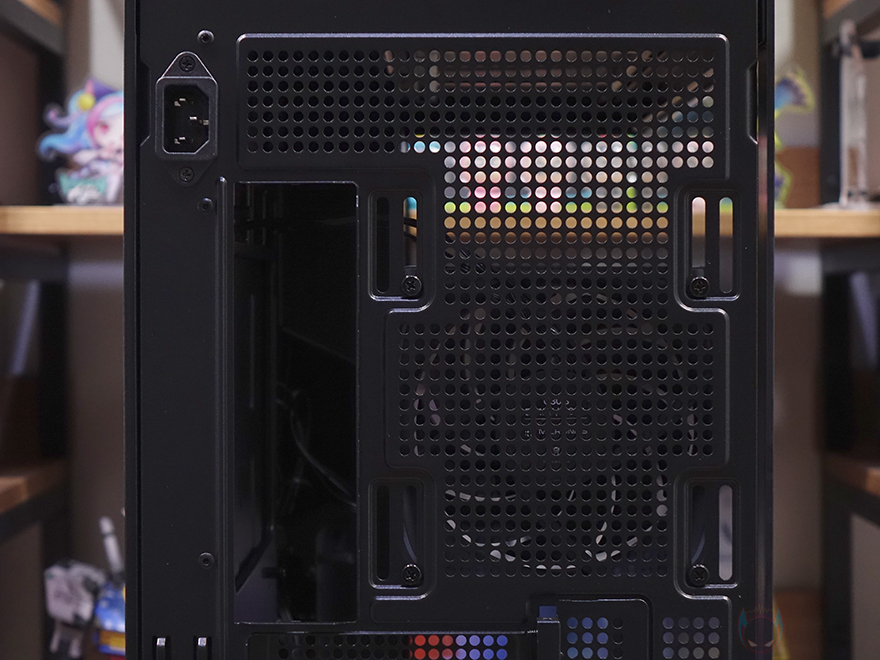 케이스 후면에는 배기역할로 타공망 디자인과 함께 내부에 120mm 팬이 기본 장착된 걸 미리 확인할 수 있으며, 140mm 팬으로도 장착할 수 있게 나사홀이 처리되어 있습니다. 또한, 팬 윗부분 내부 상단 공간만큼의 여백자리에는 타공망 처리를 해놨고, 같은 위치 맨 왼쪽에는 파워서플라이가 전면에 배치되기 때문에 전원 연장선이 추가로 적용된 걸 확인할 수 있죠. PCI 슬롯은 미들타워 기준인 7개를 갖추고 있으며, 같은 위치 맨 왼쪽에는 케이블 정리를 할 수 있는 홀더 걸이를 적용해 놨습니다. 외형 끝으로, 케이스 밑바닥 부분을 살펴보면, 받침대를 제외한 내부 하단 쿨링시스템 부분에 별도의 메쉬망을 적용했습니다. 특히 케이스 밑바닥보다 약 15mm 돌출된 내부에서 보면 매립 형태로 적용했는데, 왜 매립형태로 적용했는지는 뒤에 내부에서 확인할 수 있습니다. 물론, 내부에는 팬도 기본 장착되어 있죠. 참고로, 바깥쪽과 안쪽 메쉬망 주변에 있는 나사들을 풀면 분리가 가능합니다. 그리고, 케이스 받침대는 약 26mm 높이로 미끄럼방지 및 진동소음 최소화를 위해 패드도 기본 부착되어 있습니다.
