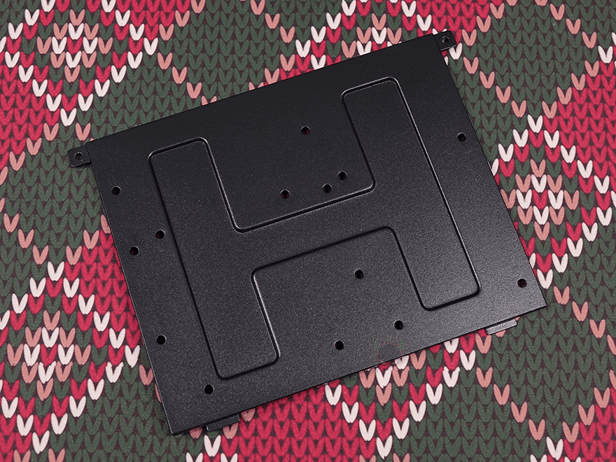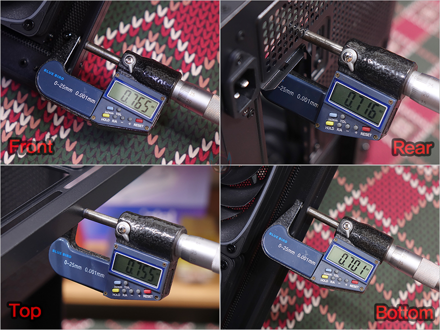 그리고, 트레이 전면 방향에는 파워서플라이 자리로 앞서 후면에서 확인한 전원 연장선의 커넥터를 확인할 수 있으며, 같은 위치에 아래는 커버를 적용하고 있는데, 나사를 풀면 도어 방식으로 열리는 구조입니다. 물론, 이 자리가 케이블 정리의 메인 공간이기도 하죠. 끝으로, 위즈맥스 스텔라 PC케이스에 사용된 새시의 두께를 주요 위치별로 측정해 보면 약 0.7mm 대인 것을 확인할 수 있습니다.
