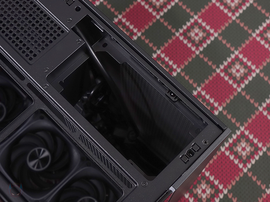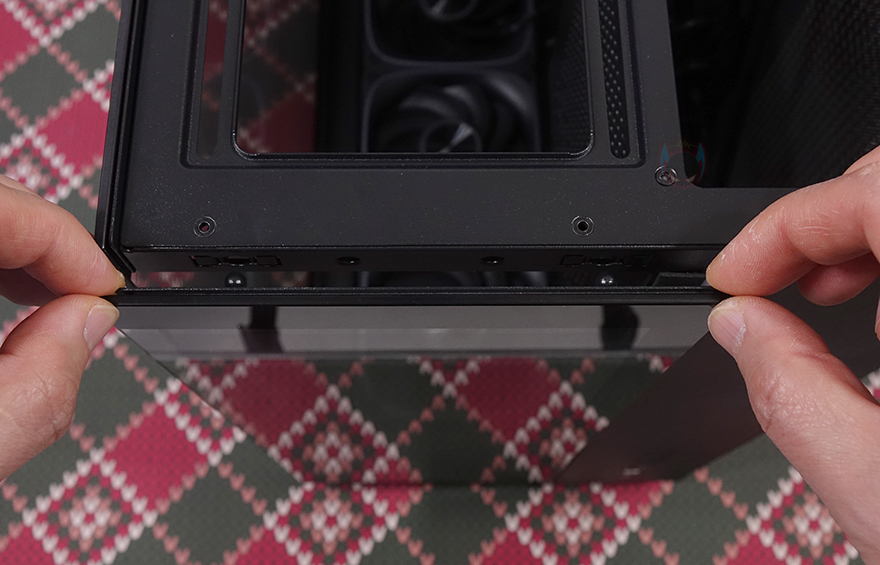 케이스 상단에는 패널에 타공망 디자인을 적용했는데, 모델이름에 맞춰서 별빛이 쏟아지는 모티브에서 디자인을 적용했으며, 상단 패널은 무나사 방식의 볼-헤드핀 방식으로 쉽게 분리할 수 있고, 패널 안쪽에는 자석방식의 먼지 필터도 적용되어 있죠. 패널을 분리하면 내부 상단에 쿨링 시스템을 갖출 수 있게 쿨링홀과 나사홀이 처리되어 있는데, 팬 장착 시 120mm 팬 최대 3개를 장착할 수 있고, 수냉쿨러시 최대 360mm 라디에이터를 장착할 수 있습니다. 그리고, 상단 전면 방향으로 맨 오른쪽에는 내부 파워서플라이 자리로 앞서 제품 박스에서 언급한 전면 파워서플라이 배치 구조를 가졌다라는 걸 미리 확인할 수 있습니다. 기존 일반적인 듀얼 챔버 구조는 후방향에 장착되는 경우가 많은데, 최근 컴퓨터 어항케이스의 폭을 줄이는 방법 중 하나로 이렇게 전면에 배치하는 제품들이 하나둘씩 늘어나고 있죠. 그리고, 상단 패널을 분리하면, 전면 강화유리 패널도 무나사 방삭의 볼-헤드핀이라 쉽게 분리할 수 있으며, 분리해 보면 LED 바가 있는 위치에 강화유리 접촉면에는 충격보호를 위해 패드가 부착된 것도 추가로 확인할 수 있습니다.