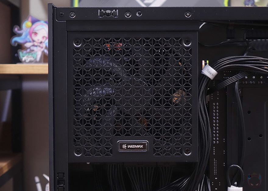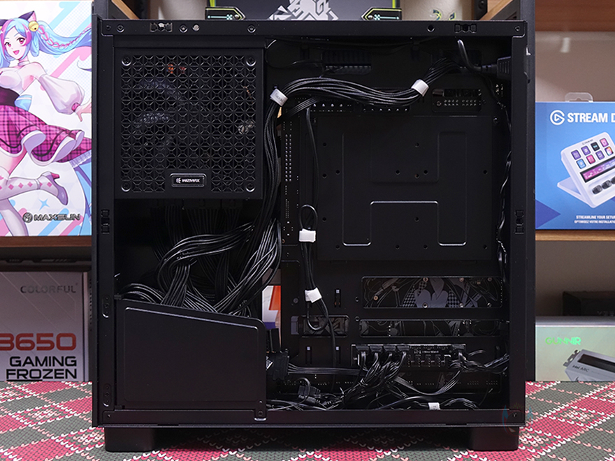 위즈맥스 스텔라 PC케이스를 사용해 시스템 조립을 해보면, 블랙 색상으로만 출시되었기 때문에 최대한 블랙 콘셉트로 조립을 해볼 텐데, 그전에 앞서 확인했듯이 백-커넥터 메인보드 장착 지원을 합니다. 그래서, 실제 백-커넥터 메인보드를 장착해 보면 후면에 배치된 메인보드 커넥터들이 홀을 완벽하게 통과하는 걸 확인할 수 있죠. 다시 본론으로 돌아와 블랙 콘센트로 최대한 맞춰 조립한 결과, CPU 쿨러 같은 경우에는 공랭 타워형 쿨러 장착시에는 최대 높이 175mm를 지원하며, 필자는 수냉 쿨러를 장착했기때문에 상단에 장착할 수 있는 최대 라디에이터 사이즈 360mm를 장착했습니다. 그리고, 그래픽카드는 최대 425mm를 지원해서 사실상 시중에 판매되는 그래픽카드는 간섭없이 모두 장착이 가능하며, 파워서플라이 같은경우에는 후면에 장착되는 듀얼 챔버 구조지만, 전면 앞자리에 장착됩니다. 앞자리에 장착되기 때문에 파워서플라이 깊이를 짧을수록, 그리고 모듈러 방식일수록 케이블 정리가 수월하고, 같은 위치 아랫 공간이 메인 케이블정리 공간임으로 최대한 활용을 해야 메인보드 트레이 후면 공간에 케이블정리 시 어려움이 없습니다. 물론, 전면 앞자리에 장착되기때문에 파워서플라이를 장착할 때 꼭 상단에 전원 연장선 연결은 필수죠.