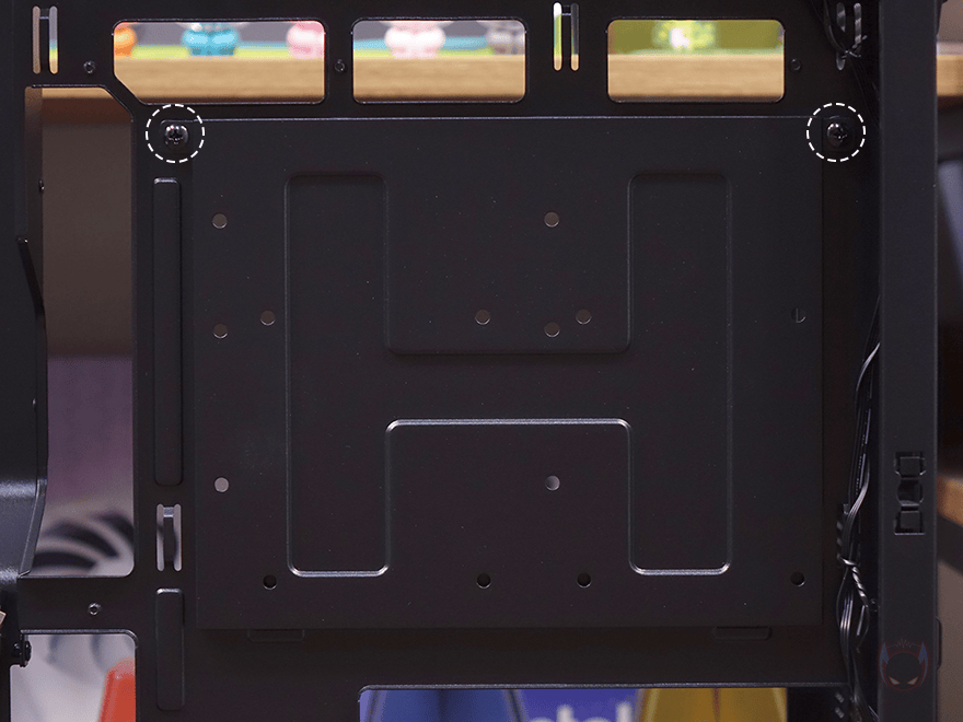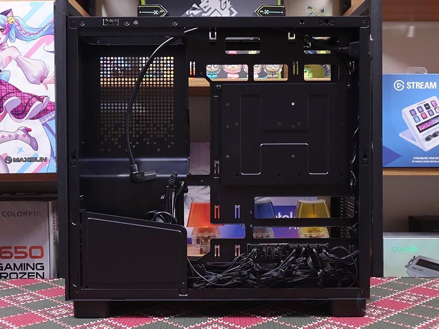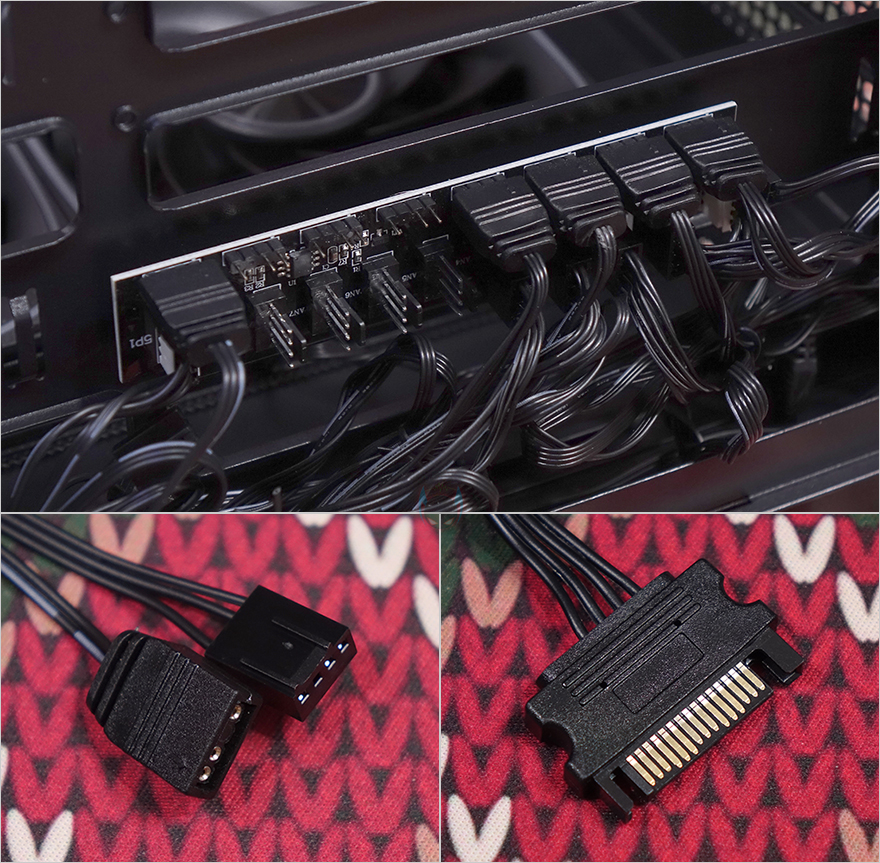 이번엔 내부 후면 그러니깐 메인보드 트레이 후면 공간을 살펴보면, 메인보드 트레이 CPU-컷-아웃 자리에는 저장장치 브래킷이 장착되어 있습니다. 양쪽 나사를 풀면 쉽게 분리가 되고, 브래킷에는 2.5인치 HDD/SSD를 최대 2개 또는 3.5인치와 겸용으로 각각 1개씩 장착할 수 있죠. 그리고, 같은 위치에 맨 아래에는 팬과 RGB 커넥터 허브가 기본 장착되어 있는데, 팬은 4핀 PWM 방식이고, RGB는 5V aRGB 방식으로 총 8개를 연결할 수 있습니다. 물론, 기본 팬과 전면 LED 바도 허브에 기본 연결되어 있고, 허브 전원 연결은 SATA 방식, 메인보드와 연결되는 커넥터 역시 4핀 PWM과 5V aRGB 방식입니다.
