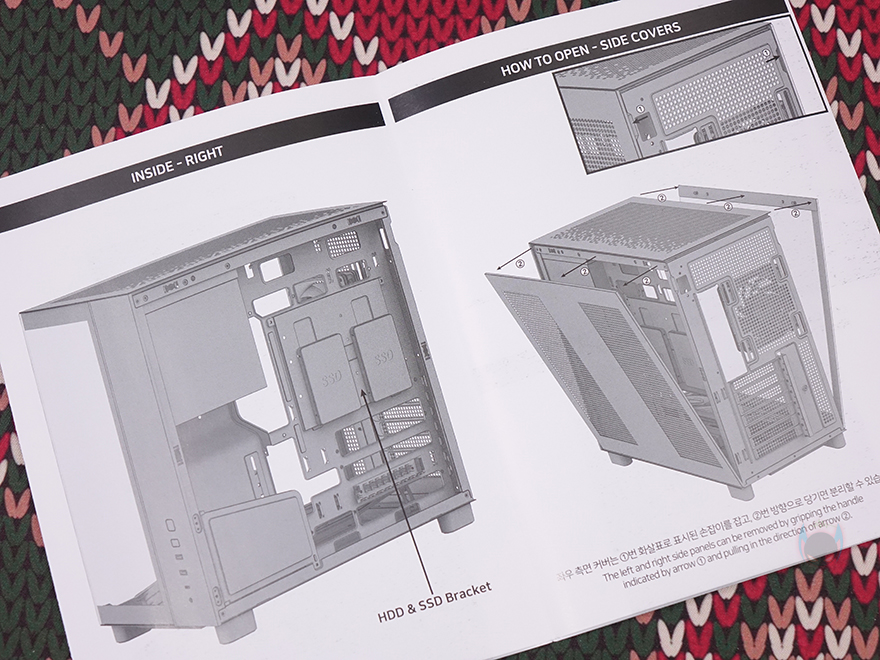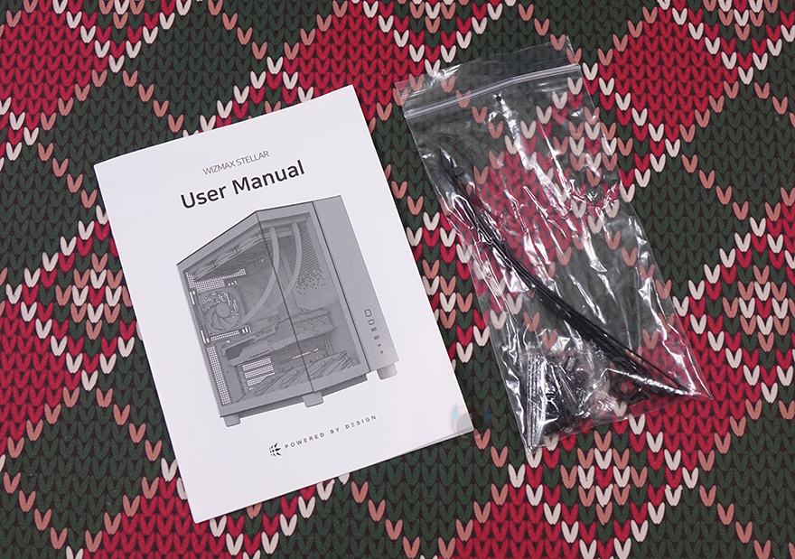 제품 포장은 PC케이스의 기본 포장이라 할 수 있는 비닐포장에 외부 충격보호를 위한 스티로폼 포장재를 사용했으며, 위즈맥스 스텔라 PC케이스를 제외한 나머지 구성품은 제품설명서와 부속품으로 부속품은 별도의 동봉 처리를 해놨으며, 부품 장착에 사용되는 나사들, 여분의 볼-헤드핀 클램프, 소량의 케이블 타이를 제공해 줍니다. 제품설명서는 그림 이미지와 함께 조립가이드를 담고 있어서 초보자에게 충분히 도움이 되며, 개봉 시 전면과 측면 강화유리에는 보호비닐이 부착되어 있죠.