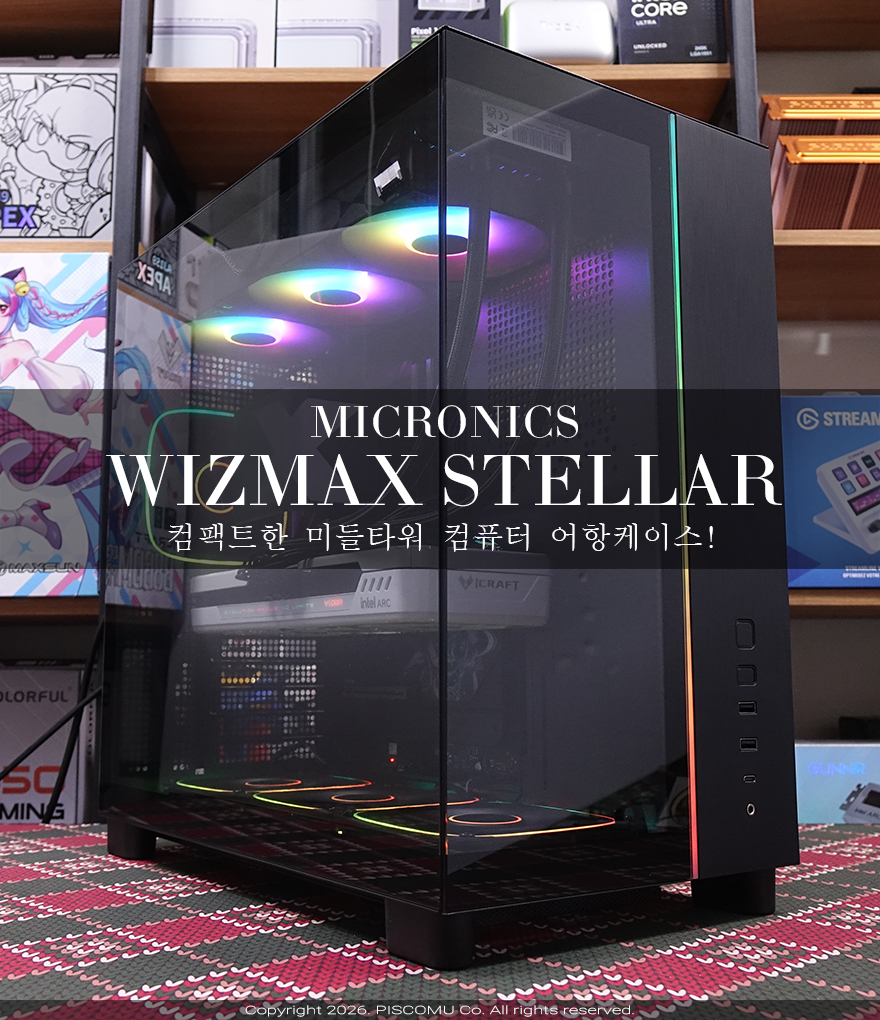 불과 3년 전 PC케이스 시장에 등장한 일명 컴퓨터 어항케이스라 불리는 파노라마-뷰 PC케이스는 이제 시장에서 주력 제품이 되었습니다. 그리고, 단순히 전면과 측면의 강화유리만 갖추고 나오는 컴퓨터 어항케이스도 점점 차별화가 중요해지고 있죠. 시각적 효과뿐만 아니라 전체적인 디자인, 쿨링, 구조 등에 변화를 주고 나오는 제품들이 점점 늘어나고 있습니다. 국내 PC케이스와 파워서플라이 시장에서 국내 브랜드로 가장 독보적인 (주)마이크로닉스 역시 시대 변화에 맞춰서 꾸준히 다양한 컴퓨터 어항케이스 제품들 선보이고 있는데, 현재 마이크로닉스의 PC케이스 라인업은 크게 쿨맥스(COOLMAX)와 위즈맥스(WIZMAX)로 나뉘고 있으며, 최근 위즈맥스 라인업에서 또 하나의 컴퓨터 어항케이스를 출시했습니다. 바로, 위즈맥스 스텔라(WIZAMAX STELLAR). 그럼, 위즈맥스 스텔라는 어떤 모습을 갖추고 나왔는지 한 번 만나보도록 하죠.