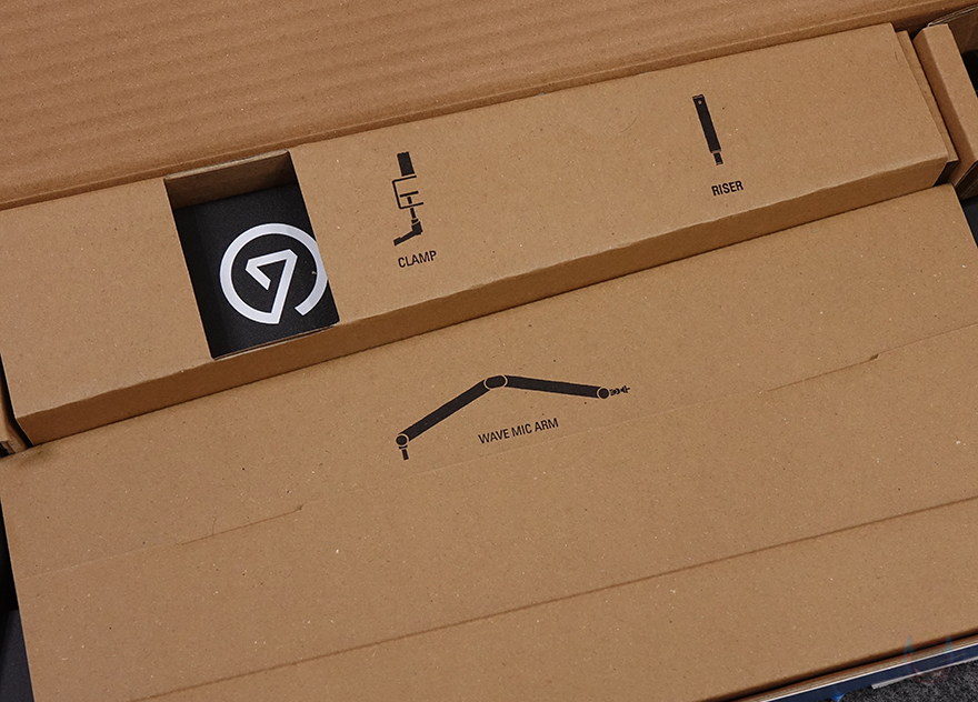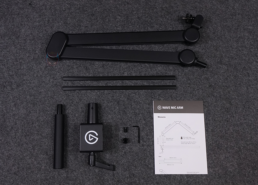 박스 오픈부분에는 엘가토 로고표시의 씰(seal)이 부착되어 있으며, 박스를 열어보면 구성품별로 나뉘어서 수납 포장된 걸 확인할 수 있습니다. 전체 제품 구성에는 웨이브 마이크암 MK.2, 케이블 커버, 라이저, 클램프, 3/8인치와 5/8인치 어댑터, 렌치, 설치가이드로 이루어져 있으며, 설치가이드에는 한국어도 포함되어 있습니다.