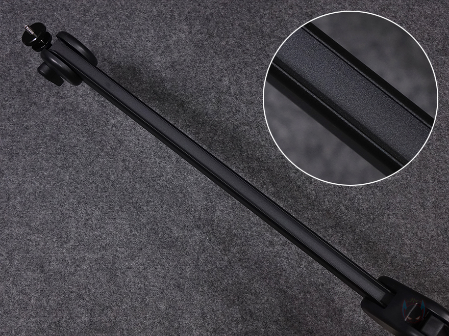 또한, 접었다 펼칠때만 관절 아랫부분으로 스프링을 가린 메탈 프레임이 노출되는 방식이라 깔끔하며, 측면에서 봤을 때는 이전 모델처럼 관절 프레임이 두께가 두꺼운처럼 보이지만, 위에서 보면 프레임 폭이 상당히 슬림해진 것을 확인할 수 있습니다. 특히, 폭 부분에 딱 마이크 케이블만 들어가는 수납공간을 만들었고, 제공되는 케이블 커버를 사용해서 깔끔하게 정리할 수 있도록 해주고 있죠. 상부암 끝부분에 있는 볼헤드 같은 경우에는 레버를 풀면 자유롭게 각도조절과 360˚ 회전이 가능해 어느 방향이든 마이크 위치를 고정할 수 있으며, 마이크 연결 나사 부분은 1/4인치에 함께 제공되는 3/8인치와 5/8인치 어댑터를 사용해 대부분의 마이크를 장착할 수 있게 지원하고 있습니다.