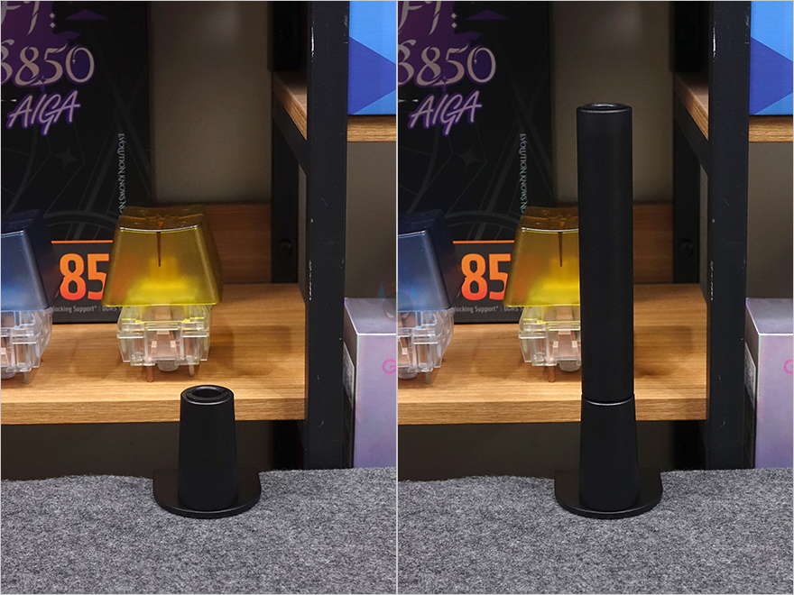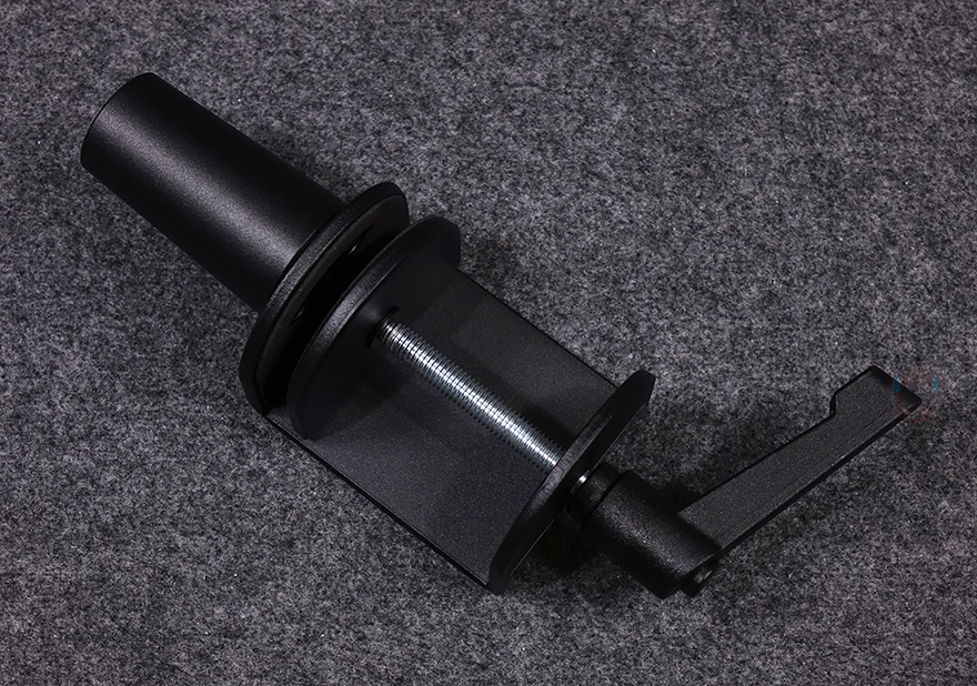 그리고, 이번 웨이브 마이크암 MK.2 제품 역시 최신 제품이라 최근 엘가토에서 스트림덱이나 웨이브 마이크에서 선보이고 있는 다양한 컬러조합 액세서리를 이번 제품에도 적용했습니다. 바로, 힌지부분의 캡을 분리해서, 다양한 색상으로 변경할 수 있죠. 다만, 아직 출시 전이라 액세서리 구입을 원했다면 좀 더 기다려야 합니다. 하부암에는 라이저 또는 클램프와 연결되는 고정대가 적용되어 있으며, 뒤에서 다시 확인하겠지만 이번 모델 역시 이전 모델과 마찬가지로 낮은 높이의 로우프로파일과 높은 높이의 오버헤드 2가지 용도로 모두 사용이 가능합니다. 로우프로파일 높이로 사용할 때는 바로 클램프와 연결하고, 오버헤드로 사용하고 싶을 때는 함께 제공되는 150mm 높이길이의 라이저를 사용하면 되죠. 라이저와 클램프 모두 측면에 압력조절이 있으며, 제공되는 육각렌치를 사용하면 되고, 삽입구 안쪽에도 마모 최소화를 위해 캡이 적용되어 있죠. 데스크에 고정시켜 주는 클램프에는 측면에 엘가토 로고를 새겨놨으며, 최대 63mm 두께에서까지 고정할 수 있으며, 위아래 받침 부분에는 패드도 기본 부착되어 있습니다.