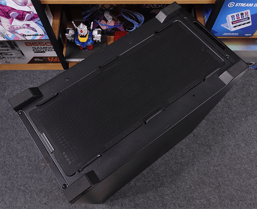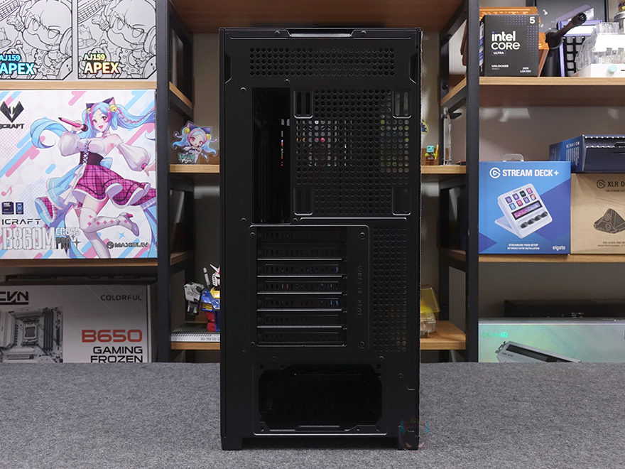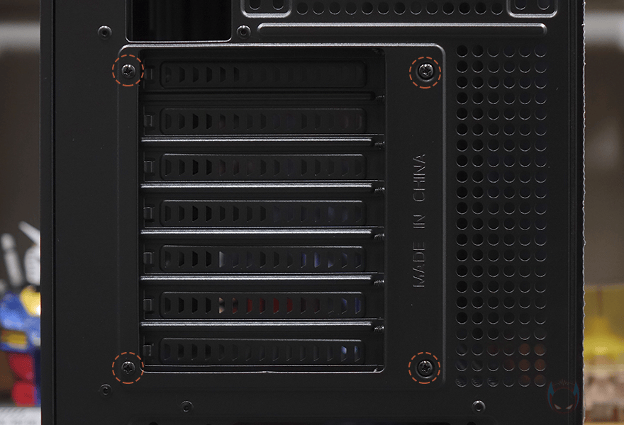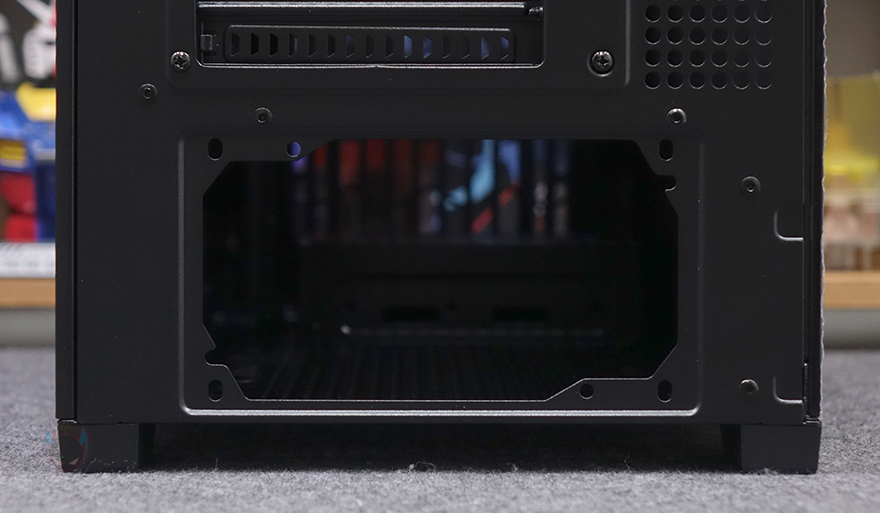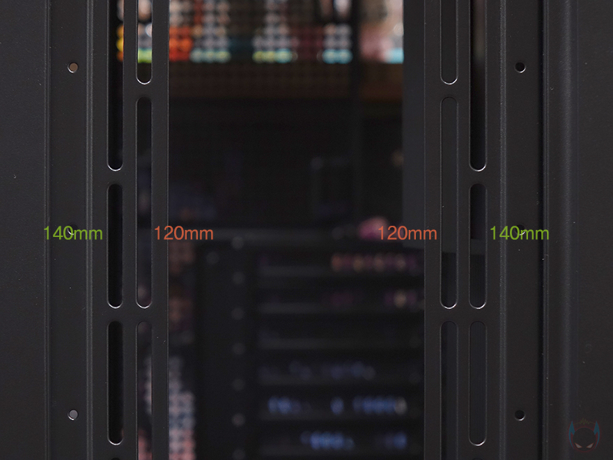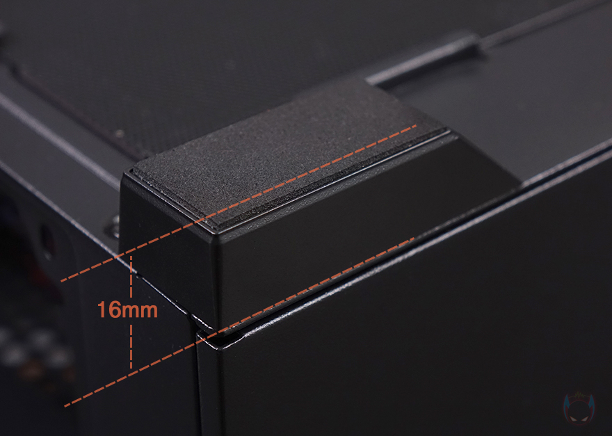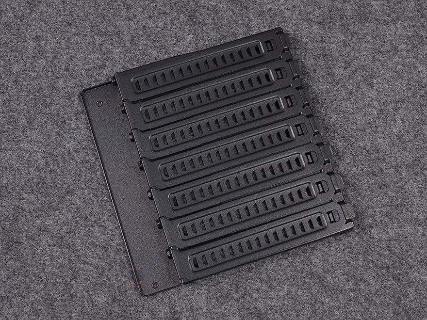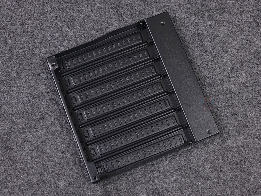 PC케이스 후면에는 윗부분에 배기역할로 에어홀 처리와 함께 내부 팬을 장착할 수 있게 나사홀이 처리되어 있으며, 140/120mm 팬 1개를 장착할 수 있습니다. 그리고, 바로 아래에는 미들타워 기준인 PCI슬롯 7개를 갖추고 있는데, PCI슬롯 주변 모서리 부근에 있는 나사를 풀면 PCI슬롯 전체 프레임을 분리할 수 있습니다. 분리한 PCI슬롯 프레임은 90˚ 방향 전환이 가능해 그래픽카드(VGA)를 수직방향(vertical)으로 장착할 수 있게 지원하죠. 물론, PCIe 라이저 케이블(pcie riser cable)은 별도로 구비하고 있어야 합니다. 그리고, PCI슬롯 가이드는 모두 재사용이 가능한 착탈식이며, 후면 맨 아래는 파워서플라이 자리로 상하방향 모두 장착이 가능하게 나사홀이 처리되어 있습니다. 외형 끝으로, PC케이스 밑바닥 부분에는 받침대를 제외한 전체 구간에 자석방식의 분리형 먼지필터가 기본 장착되어 있으며, 필터를 분리하면 하단 쿨링효과를 위해 에어홀이 처리된 걸 확인할 수 있죠. 받침대는 약 16mm 높이를 가졌고, 패드도 기본 부착되어 있습니다.