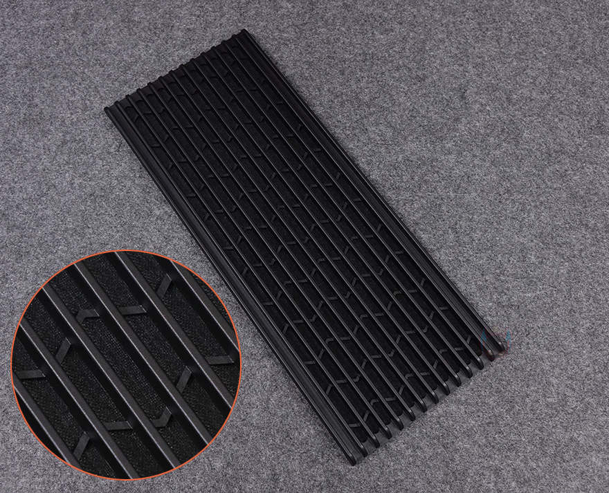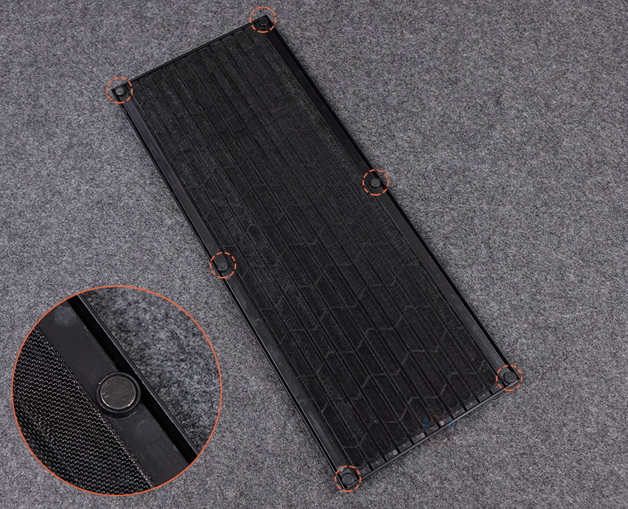 본격적으로 Mechanic Master(메카닉 마스터)의 D36 PC케이스를 살펴보면, 먼저 전체적인 제품 색상은 블랙이며 1가지 색상으로만 출시했습니다. 그리고, 전면에는 위아래 베젤 부분에 각각 포인트로 오렌지색(Orange color) 문구와 로고를 새겨놨죠. 전면에는 수직라인의 스트라이프 디자인(striped pattern)을 적용하고 있는데, 스트라이프 부분은 볼록하게 주변은 오목하게 들어간 디자인으로 입체감을 살리고 있으며, 마그네틱 패널(magnetic panel)이라 쉽게 분리할 수 있습니다. 패널 안쪽에는 스트라이프를 가로지르는 패턴 디자인이 또 한 번 적용되어 있으며, 안쪽에는 먼지필터(dust filter)가 부착되어 있죠. 마그네틱 패널을 분리하면 전면 내부에 전면 쿨링시스템을 갖출 수 있게 양쪽으로 나사홀이 처리되어 있는데, 팬(Fan) 장착 시 140/120mm 최대 3개를 장착할 수 있으며, 수냉쿨러(Liquid cooler) 사용 시 최대 420mm 라디에이터(Radiator)를 장착할 수 있습니다.