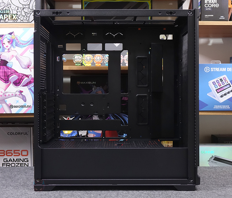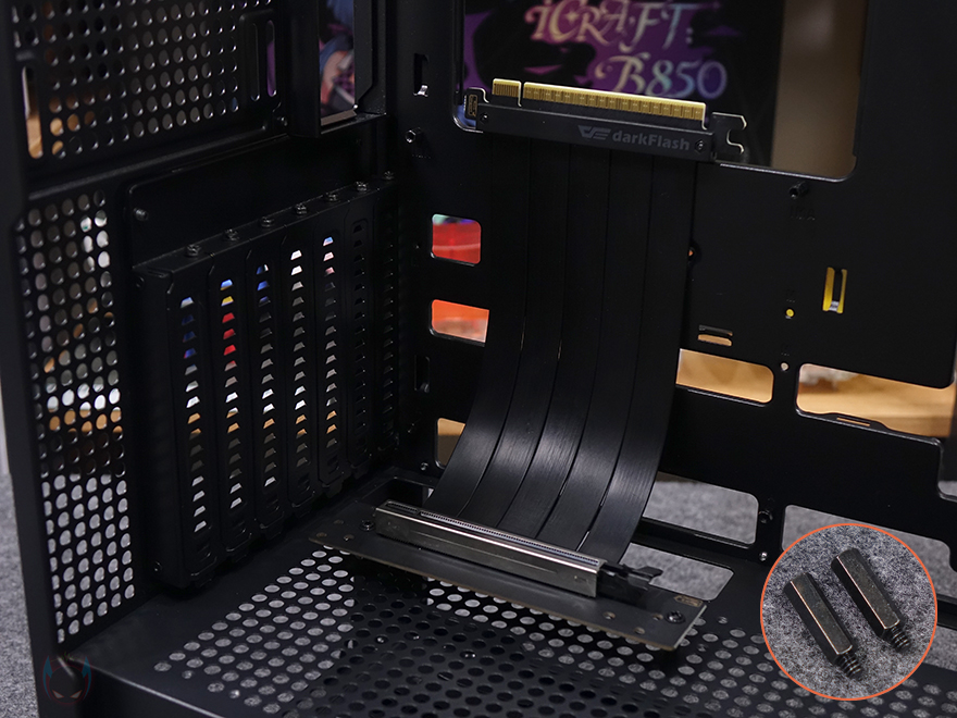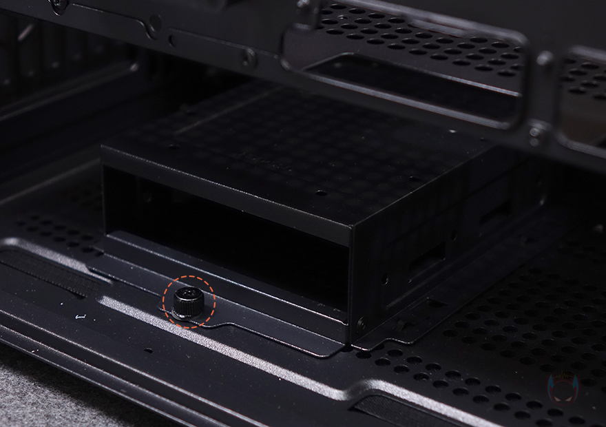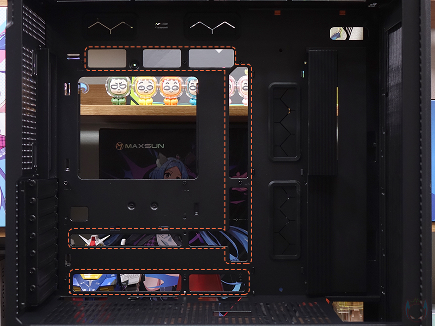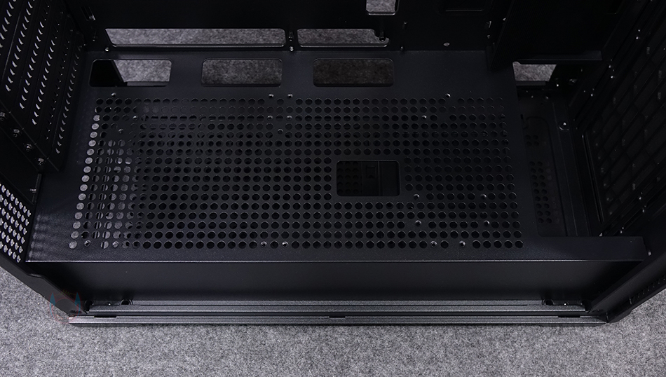이제 Mechanic Master D36 PC케이스의 내부를 살펴보는데, 메인보드가 장착되는 트레이 부분에는 앞서 제품 콘셉트 문구 표기대로 일명 BTF라 부르고 있는 백-커넥터 메인보드(Back connector motherboard) 장착 지원을 위해 홀 처리가 되어 있습니다. 물론, CPU 쿨러 교체 편의를 위한 CPU-cut-Out 홀도 처리되어 있고, 트레이 주변으로 케이블 정리를 할 수 있는 홀과 고무재질 그로밋도 적용되었습니다. 특히, 고무재질 그로밋 부분의 오른쪽 위치에는 케이블을 가려주는 커버(Cover)도 적용되어 있는데, 후면에 나사를 풀면 좌우 위치 이동도 가능하죠. 내부 하단에는 PSU 공간과 분리되는 PSU 커버도 적용되어 있는데, 전면 방향 앞부분에는 수냉쿨러 라디에이터를 장착할 수 있게 홀 처리를 해놨으며, 커버 상단에는 하단 쿨링시스템을 갖출 수 있게 에어홀 처리와 함께 팬 나사홀도 처리되어 있어서, 140/120mm 팬을 최대 2개 장착할 수 있습니다. 또한, 앞서 확인한 PCI슬롯 프레임을 수직방향으로 변경할 수 있어서 라이저 케이블만 있으면 케이블 받침대 역할을 하는 Stand-off도 기본 제공해주고 있죠.