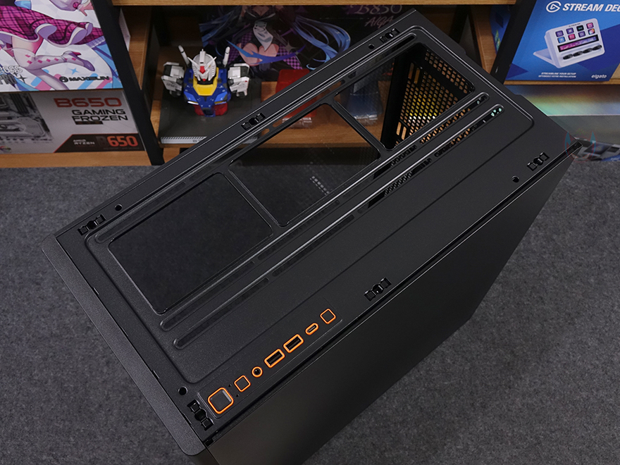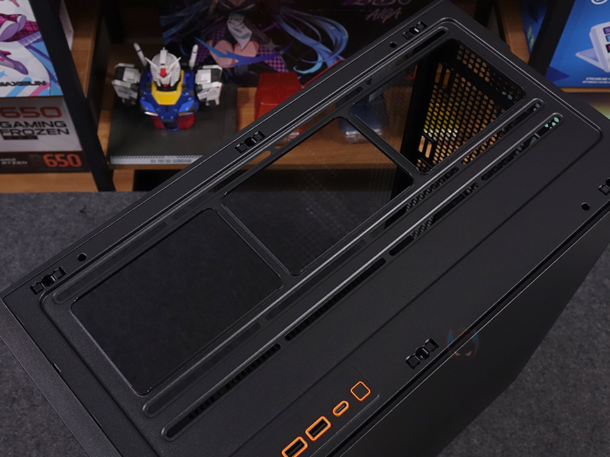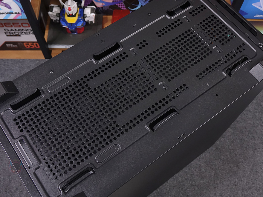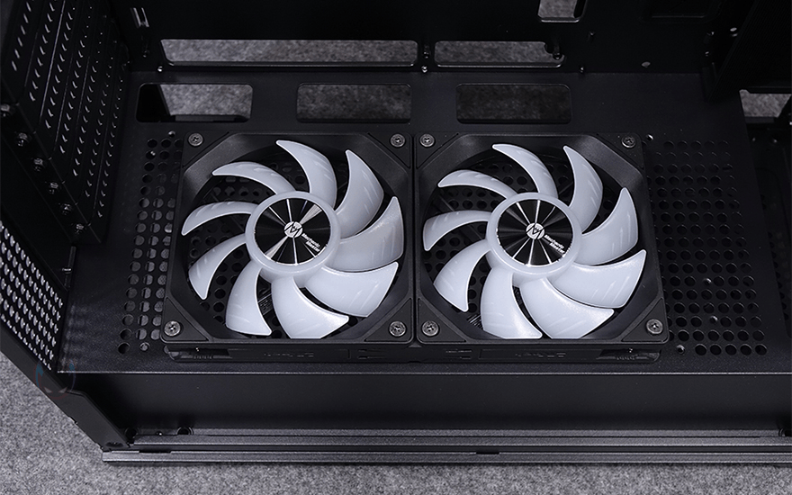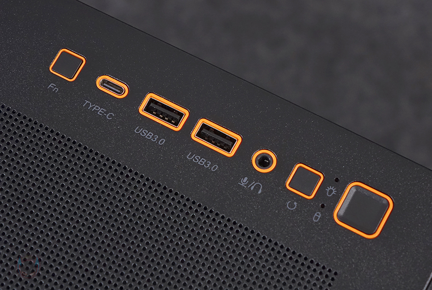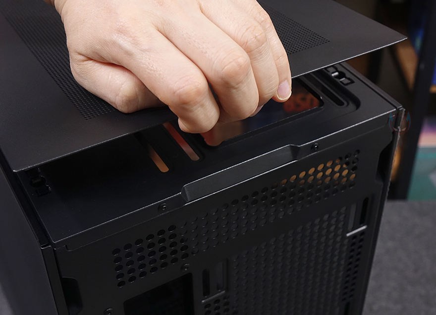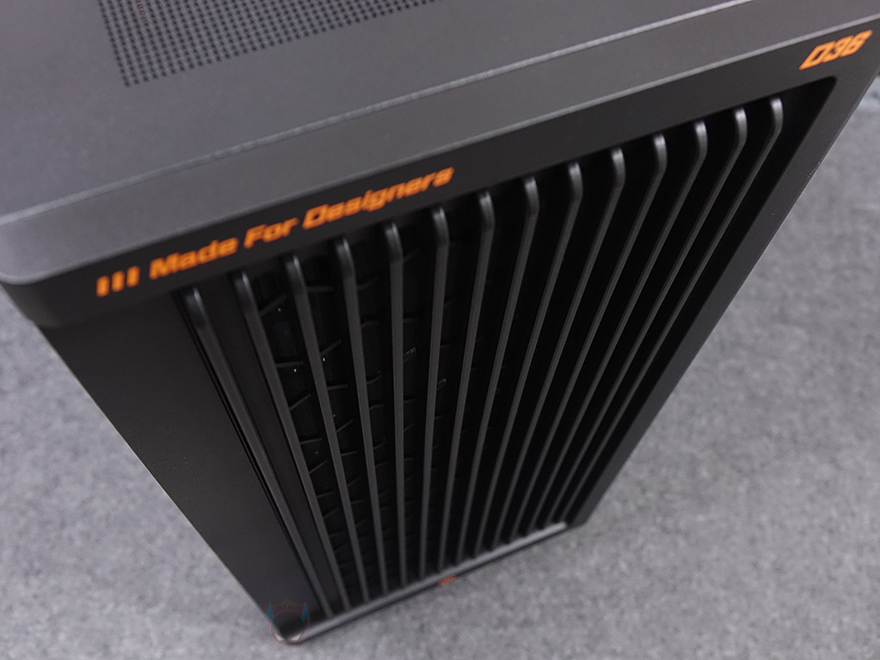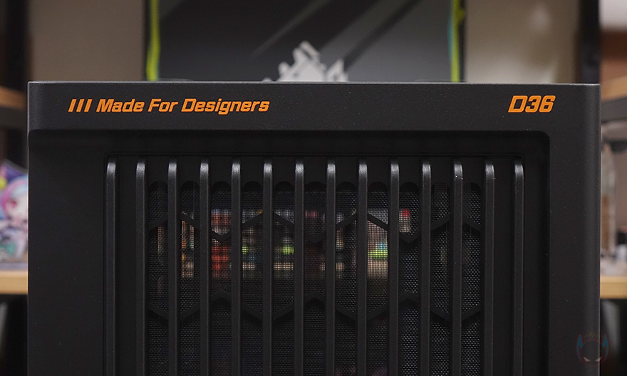 D36 PC케이스 상단에는 일반 에어홀보다 작은 촘촘한 구멍의 에어홀 처리를 해 전면 패널과 달리 별도의 먼지 필터를 적용하지 않았으며, 맨 오른쪽 앞부분에는 버튼 및 포트들이 배치되어 있는데, 맨 앞에 전원버튼(Power button)을 시작으로 리셋, 오디오 포트, USB 3.0 포트 2개, USB-C 포트 1개, Fn 버튼순으로 배치되어 있습니다. 상단 패널은 새시 자체 패널로 후면 손잡이 홈을 통해 위로 들어 올리면 쉽게 분리할 수 있는 볼-헤드핀(ball-head pin) 방식입니다. 상단 패널을 분리하면 내부 상단 역시 쿨링 시스템(Cooling system)을 갖출 수 있게 지원하는데, 팬 장착 시 120mm 최대 3개 또는 140mm 최대 2개를 장착할 수 있으며, 수냉쿨러시 최대 360mm 라디에이터를 장착할 수 있습니다.