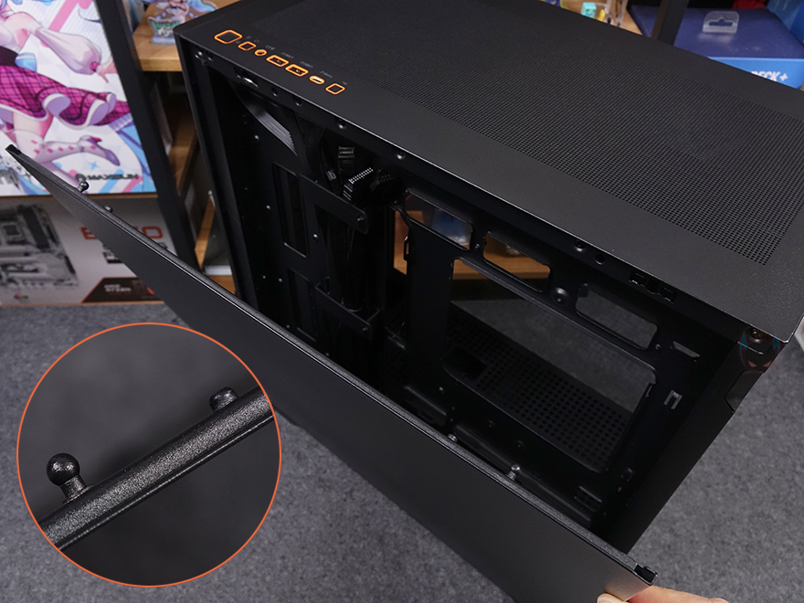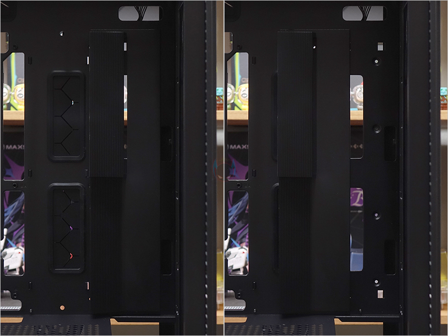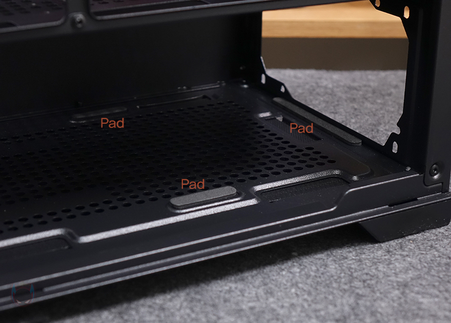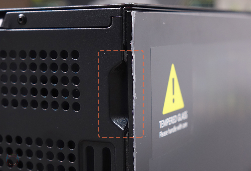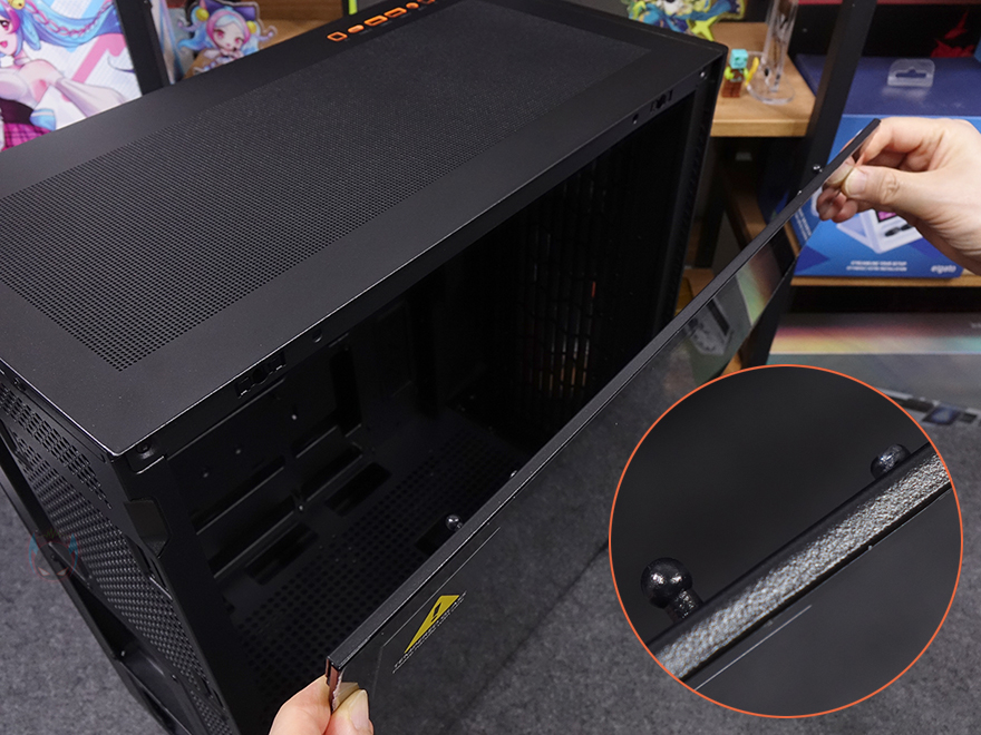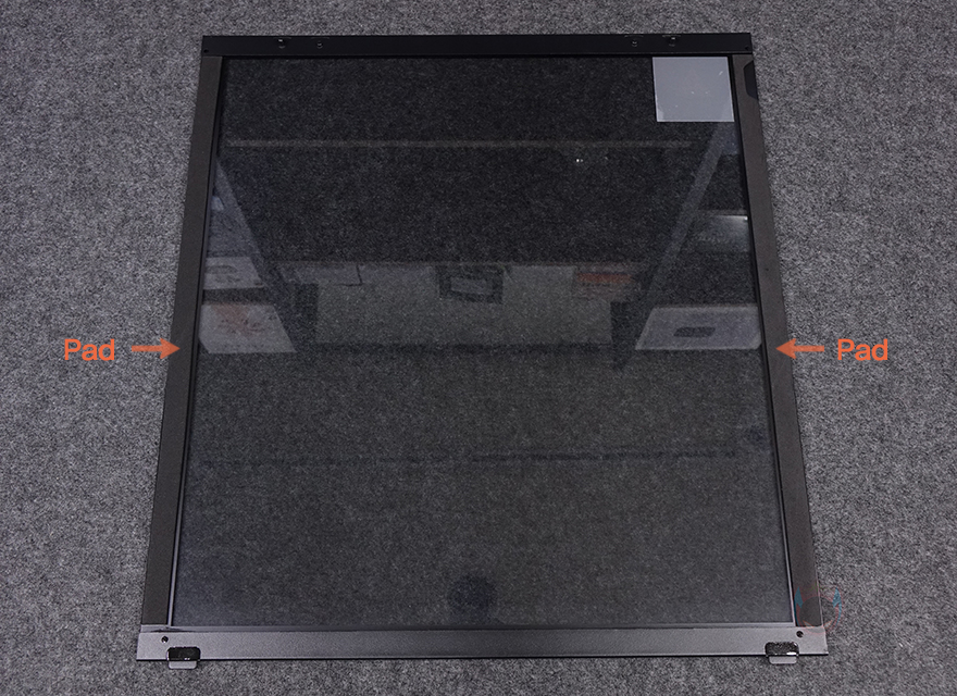 사이드 패널은 전면 기준으로 왼쪽 패널은 강화유리를 적용하고 있는데, 제품 색상과 어울리게 강화유리 역시 스모그 유리(Smog glass)를 적용했으며, 패널 분리 역시 상단과 마찬가지로 후면 손잡이 홈을 이용해 쉽게 분리할 수 있는 볼-헤드핀 방식을 적용했습니다. 강화유리 안쪽에는 파손방지를 위해 위아래는 프레임을 적용했고, 좌우 양쪽에는 충격보호를 위해 패드(Pad)를 부착해 놨습니다. 오른쪽 패널은 일반 새시 패널이며, 분리 역시 왼쪽 패널과 동일합니다.