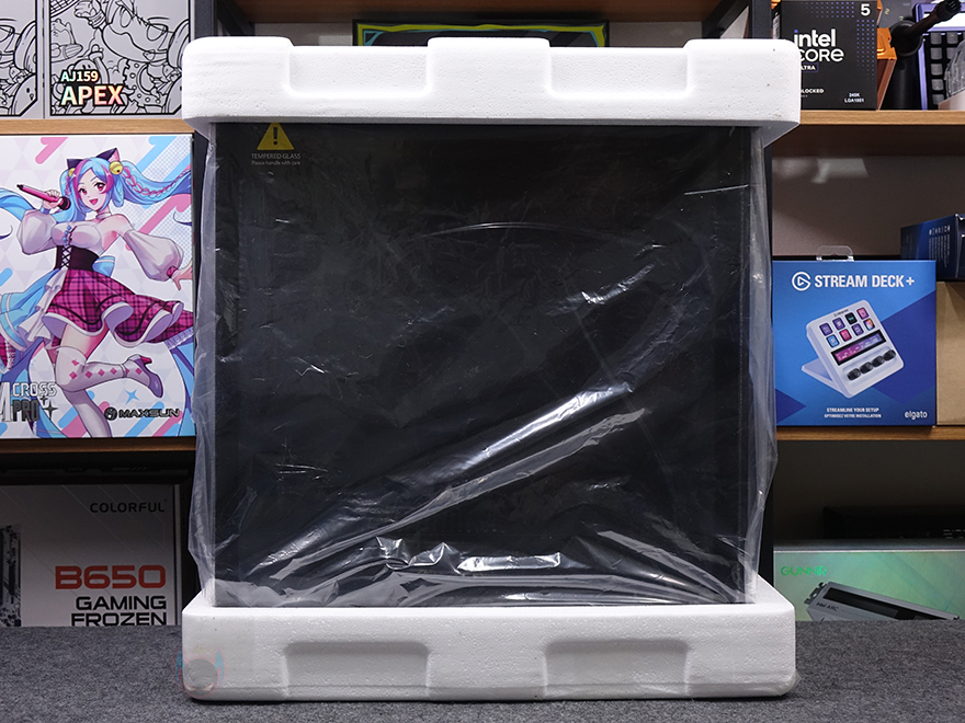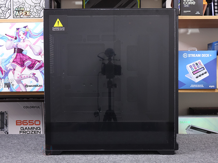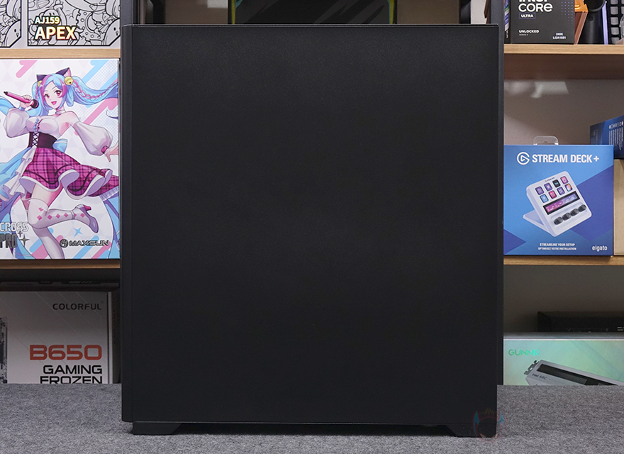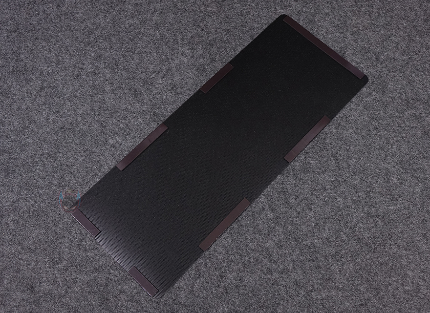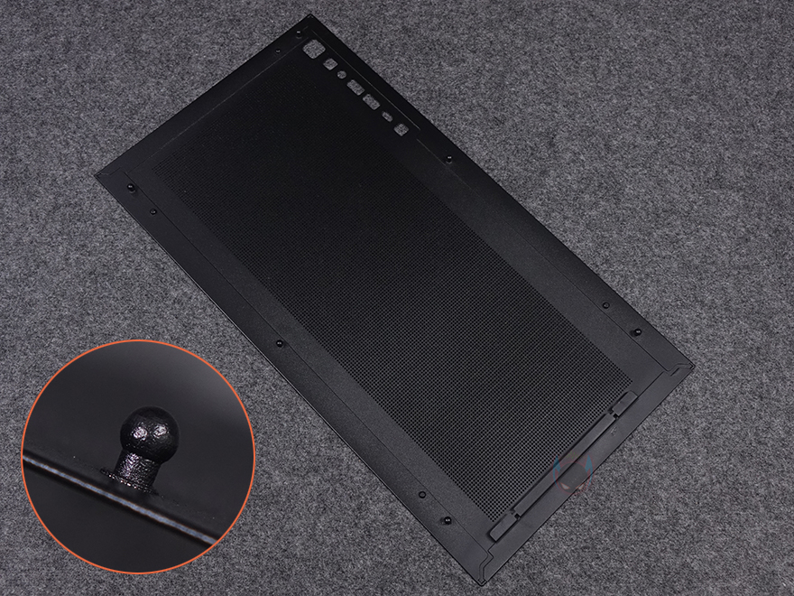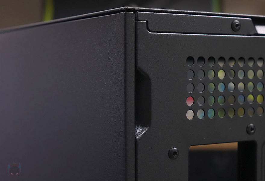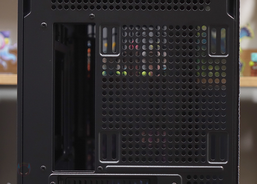 사이드 패널은 전면 기준으로 왼쪽 패널은 강화유리를 적용하고 있는데, 제품 색상과 어울리게 강화유리 역시 스모그 유리(Smog glass)를 적용했으며, 패널 분리 역시 상단과 마찬가지로 후면 손잡이 홈을 이용해 쉽게 분리할 수 있는 볼-헤드핀 방식을 적용했습니다. 강화유리 안쪽에는 파손방지를 위해 위아래는 프레임을 적용했고, 좌우 양쪽에는 충격보호를 위해 패드(Pad)를 부착해 놨습니다. 오른쪽 패널은 일반 새시 패널이며, 분리 역시 왼쪽 패널과 동일합니다.