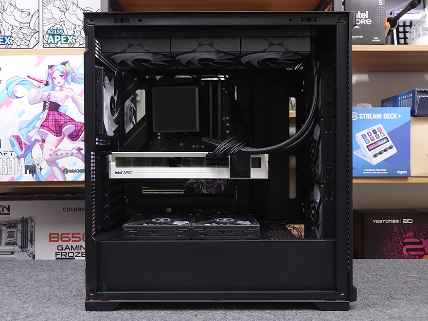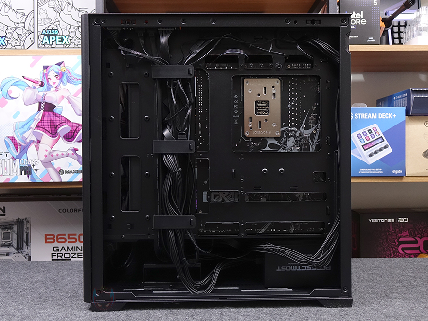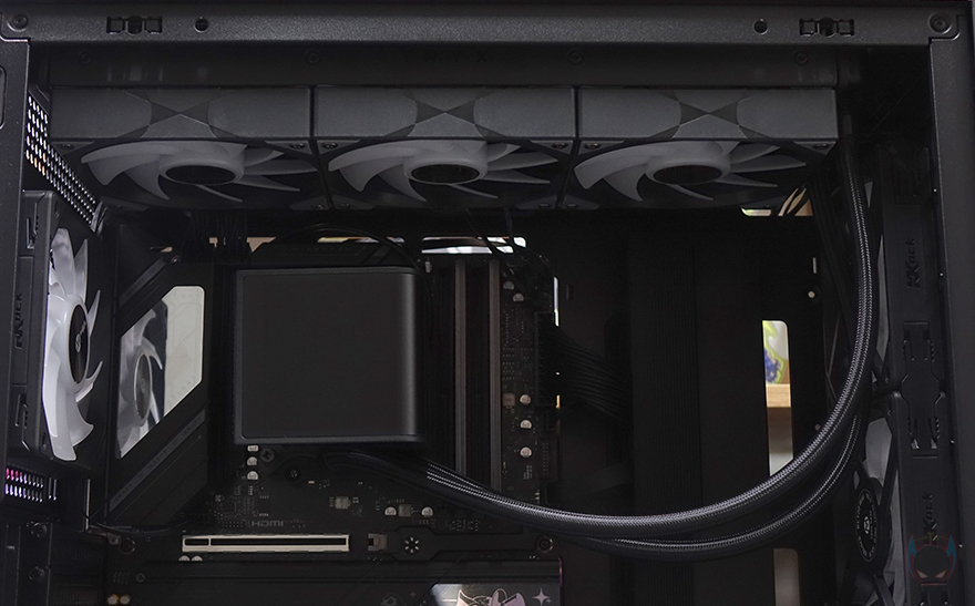 직접, Mechanic Master(메카닉 마스터) D36 PC케이스를 사용해 시스템 조립을 해보면, PC케이스 색상이 블랙이기 때문에 최대한 블랙 색상 콘셉트로 맞춰보는데, 그전에 앞서 메인보드 트레이에서 확인했듯이 백-커넥터 메인보드인 일명 BTF 메인보드를 장착 지원합니다. 그래서, 실제 BTF 메인보드를 장착해 보면, 정확하게 백-커넥터들이 트레이 뒤편으로 통과되는 걸 확인할 수 있죠. 다시 본 조립으로 돌아와 부품별 장착을 해보면, CPU 쿨러 같은 경우 수냉쿨러시 전면에 라디에이터를 배치하면 최대 420mm, 상단에 배치하면 최대 360mm를 장착할 수 있는데, 필자는 전면에 팬을 장착했기때문에 상단에 360mm 라디에이터를 장착했습니다. 참고로, 공랭쿨러(Air cooler) 장착시에는 최대 높이 185mm를 지원합니다. 그리고, 그래픽카드(VGA) 같은경우 전면 팬 장착시 최대 435mm 길이를 지원해 시중에 판매되는 그래픽카드는 사실상 다 장착된다고 보면 돼고, 수냉쿨러 라디에이터를 장착하면, 최대 405~410mm 길이까지 지원합니다. 또한, D36 PC케이스 같은경우 기본 팬 제공이 없기 때문에 사용자가 별도로 팬을 장착해야 하는데, 기본적으로 전면 흡기역할의 팬과 후면 배기 역할의 팬은 필수로 장착해야 하며, 내부 하단이나 상단은 환경에 따라 사용자가 결정 및 선택하면 됩니다.
