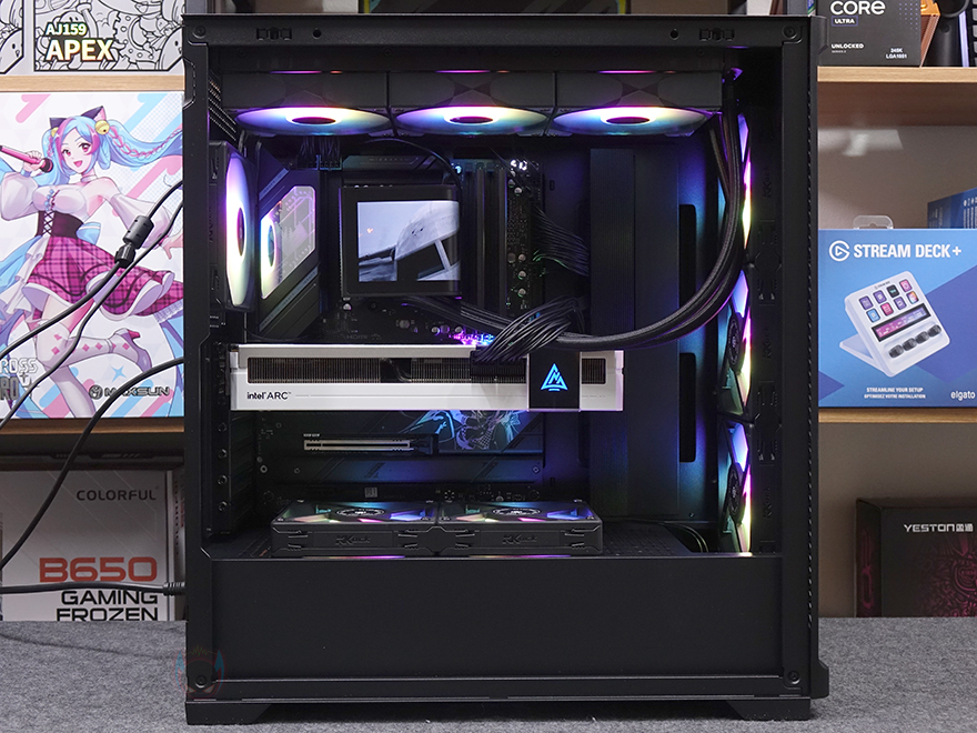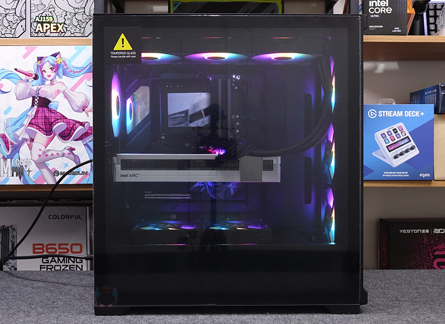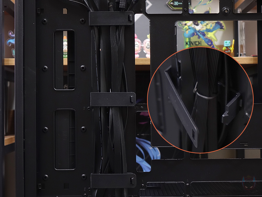 부품 장착이 끝나면 케이블 정리는 메인보드 트레이 후면 공간이 약 25mm이고, 클램프 방식의 케이블정리 홀더 장치가 있어서 어렵지 않고 수월하게 정리할 수 있습니다. 또한, 메인보드 트레이 오른쪽에 배치된 케이블 커버가 갈려주는 효과도 있어서 깔끔한 내부를 조립 초보자도 어렵지 않게 구현할 수 있죠. 그리고, 조립을 마치고 전원을 켜면 내부 RGB 장치에 따라 라이트닝 효과도 전면과 측면 강화유리를 통해 확인할 수 있습니다.