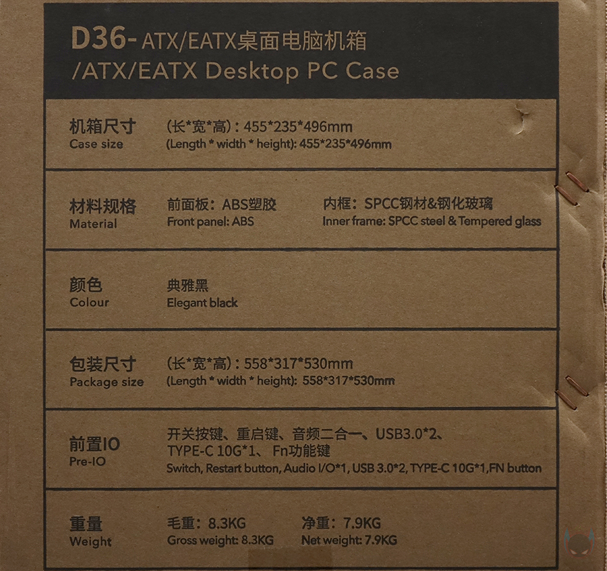 제품박스부터 살펴보면, 전후면에는 각각 모델명과 함께 제품 일부 이미지를 담고 있습니다. 모델명 옆에는 중국어 문구와 함께 영어로도 제품 콘셉트 문구를 표기해 놨으며, 쿨링 퍼포먼스와 BTF 메인보드 지원 PC케이스라는 걸 쉽게 짐작할 수 있죠. 한쪽 측면에는 제품의 기본 사양을 표기해 놨는데, 중국어/영어 둘 다 표기해 놨기 때문에 쉽게 알아볼 수 있고, 반대쪽 측면에는 제품 구성품 목록 표기를 확인할 수 있습니다.