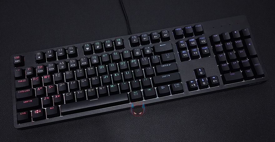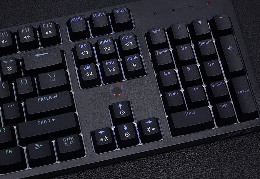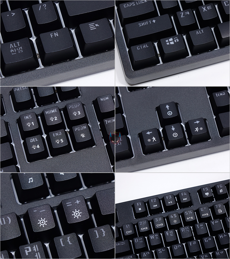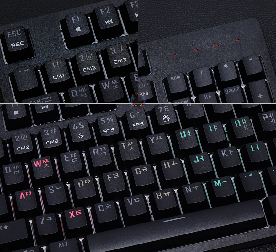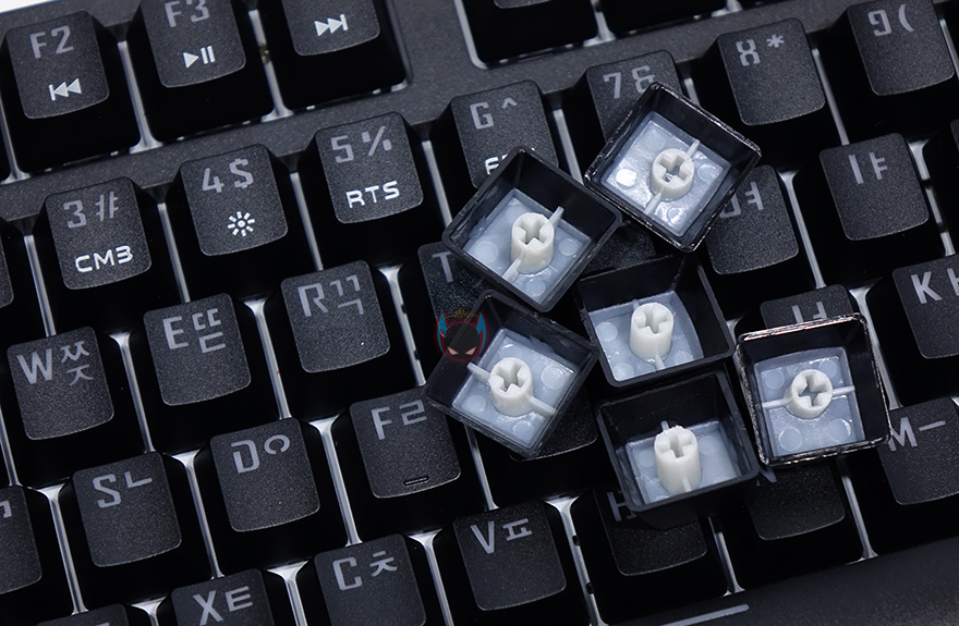 좀 더 자세히 살펴보면, 키-캡은 ABS재질에 이중사출 방식으로 처리되어 있으며, 부가 기능 표시들은 일반적인 프린팅 인쇄로 처리되어 있습니다. 그리고, 스위치는 이미 앞서 언급했듯이 마이크로닉스에서 직접 개발한 마닉 스위치가 적용되어 있는데, 마닉 스위치는 청축, 갈척, 적축 3가지로 개발되었는데, 국내 소비자들에게 흑축이 일반적으로 인기가 없다라는 점에서 3가지 스위치로만 개발되었다라는 점은 반영을 잘 했다고 볼 수 있고, 마닉 적축은 체리 적축처럼 키를 누를 때 걸리는 클릭감 없이 스무스하게 들어가는 느낌 그대로를 전달해줍니다. 이 외에도 스페이스-바 같은 긴 키들의 스테빌라이저는 체리식으로 윤활처리도 충분히 사용되었습니다.