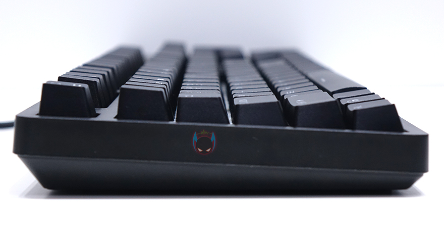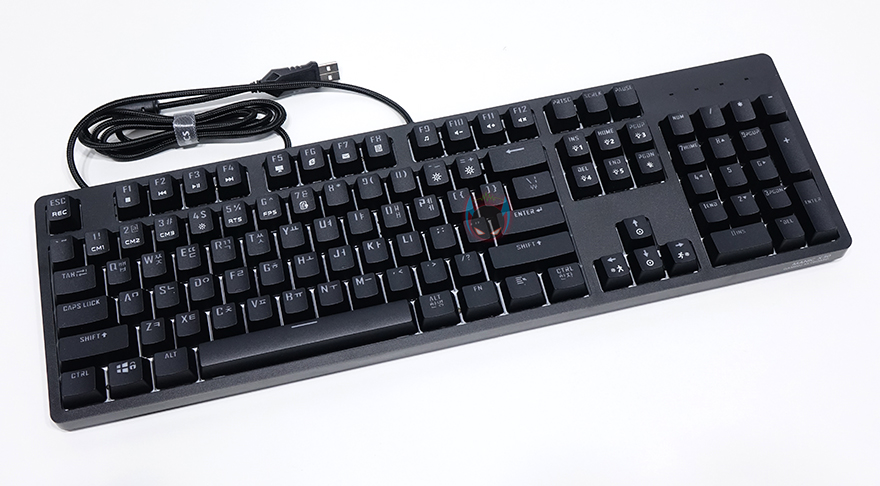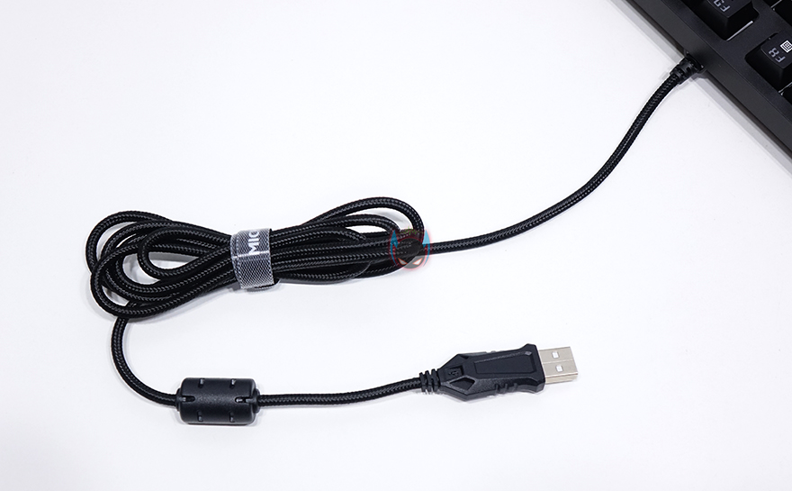 그리고, 키보드 측면에서 보면 타이핑에 최적화라 불리우는 스텝-스컬처2 단계배열을 갖추고 있고, 키보드 밑바닥부분에는 아랫부분과 앞쪽에 높낮이 받침대부분에 고무패드를 적용하고 있으며, 케이블은 꼬임방지를 위해 패브릭 케이블로 적용, 총 1.5m의 길이와 신호손실을 최소화 되도록 노이즈 필터를 적용했습니다. 연결 인터페이스는 USB방식으로 전송제어속도(폴링레이트) 1000Hz를 지원해서 반응속도는 경쟁사들처럼 빠르다 할 수 있습니다.