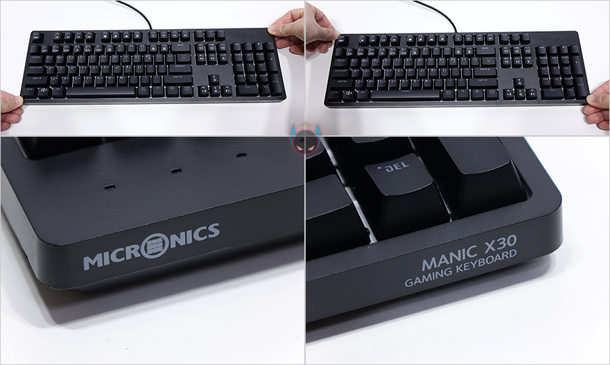 그럼, 마이크로닉스의 MANIC X30 마닉축 기계식키보드 외형을 살펴보면, 전체적으로 블랙색상을 갖췄으며, 전형적인 104키 풀-배열 키보드입니다. 케이스 재질을 플라스틱인데, 조금 아쉬운 점이 대각선 방향으로 각각 바닥과의 유격 상태를 확인해본 결과 왼쪽에서 오른쪽 대각선일 때 약간의 유격이 있습니다. 물론, 제가 받은 제품에서만 생기는 부분일수도 있으니 일반적으로 저렴하게 나오는 기계식키보드 제품들이 플라스틱 재질을 사용했을 때 빈번히 발생하는 단점 중 하나이기 때문에 마감처리가 조금은 아쉽습니다. 그리고, 케이스 베젤 테두리 한쪽 부분에는 각각 회사명과 모델명을 새겨놨습니다.