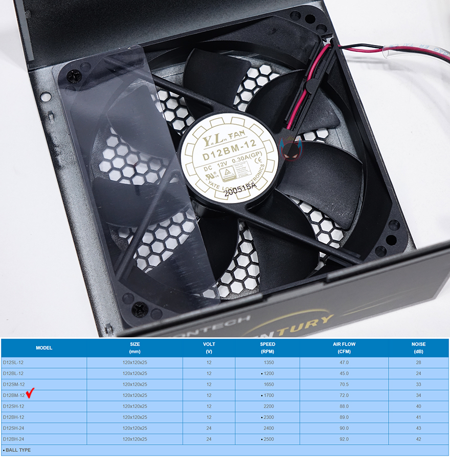 그리고, 본체 상단부분에는 벌집 모양의 에어홀처리와 함께 내부에 120mm 팬이 장착된 것을 확인할 수 있으며, 후면 배기역할도 벌집 모양으로 에어홀 처리가 된 것을 확인할 수 있죠. 본체 밑바닥부분에는 해당 모델의 제품사양을 다시 한 번 확인할 수 있는데, 참고로 이번 센추리(Century) 모델은 550W, 650W, 850W 3가지 용량으로 출시되었습니다.