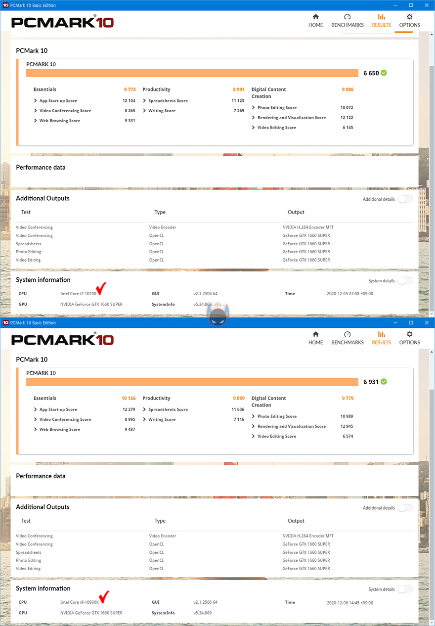 i9-10900K CPU는 i7-10700 CPU보다 코어/쓰레드 모두 더 많죠. 당연히 성능이 앞선다라는 것을 쉽게 짐작할 수 있습니다. 그래서, 이런 코어와 쓰레드의 차이를 통한 성능 차이를 쉽게 알 수 있는 벤치마크 4종을 먼저 실행해보면, 단순한 CPU 연산작업뿐만 아니라 렌더링 같은 작업이나 전체 시스템 그리고 게임 같은 그래픽 성능에서도 CPU의 영향이 코어와 쓰레드 차이에 따라 다르다라는 것을 알 수 있고, i9-10900K가 역시 그 성능을 입증해 줍니다.