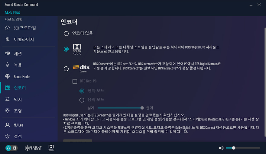 앞에서 이미 여러 번 언급을 했듯이, 이전 사운드블라스터X AE-5와 이번 AE-5 Plus 모델과의 가장 큰 차이점은 인코딩 지원입니다. 이부분은 프로그램에서도 바로 차이를 알 수 있죠. 이전 AE-5 모델을 사용하면 프로그램에 인코딩 메뉴가 없고, AE-5 Plus 모델을 사용하면 인코딩 메뉴가 있습니다. 상위 사운드카드인 사운드블라스터 AE-7, 9 모델처럼 AE-5 Plus에서부터 이제 돌비 디지털 라이브와 DTS 인코딩 효과를 볼 수 있는겁니다. 게임부터 영상/음악까지 다채널 스피커나 서라운드 헤드폰을 사용하는 사용자들에게는 훨씬 더 입체감 있는 사운드를 즐길 수 있어서 가장 반가운 기능이라 할 수 있습니다. 개인적으로도 이 기능이 가장 마음에 들었습니다.