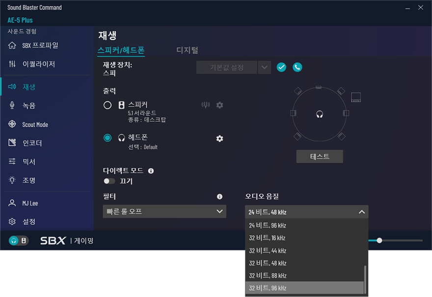 또한, 프로그램-재생 설정을 통해서는 자신이 사용하는 헤드폰에 맞춰서 임피던스 범위를 설정할 수 있는 부분도 상당히 매리트가 있죠. 물론, 요즘 게이밍헤드셋 제품들이 대부분 32Ω을 넘기는 경우가 잘 없지만, 그래도 일부 특정 게이밍 헤드셋이나 전문가용 헤드셋 제품들은 훨씬 높은 임피던스값을 적용하는 경우가 있기때문에 이런 헤드셋 제품을 사용하는 사용자들에게는 좀 더 선명하고 정확한 사운드 전달을 해줄 수 있겠습니다. 물론, 오디오 음질도 최대 32비트까지 설정할 수 있죠. 또한, FPS게임을 좋아하는 분들이라면 발소리나 무기 장착 소리에 민감하게 반응하기 때문에 이런 사운드를 강조해주는 스카우트 모드도 AE-5 Plus에서도 유지되기 때문에 유용한 기능 중 하나입니다. 단, 스카우트 모드를 활성화하면, SBX 프로파일과 이퀄라이저 기능은 비활성화 됩니다.